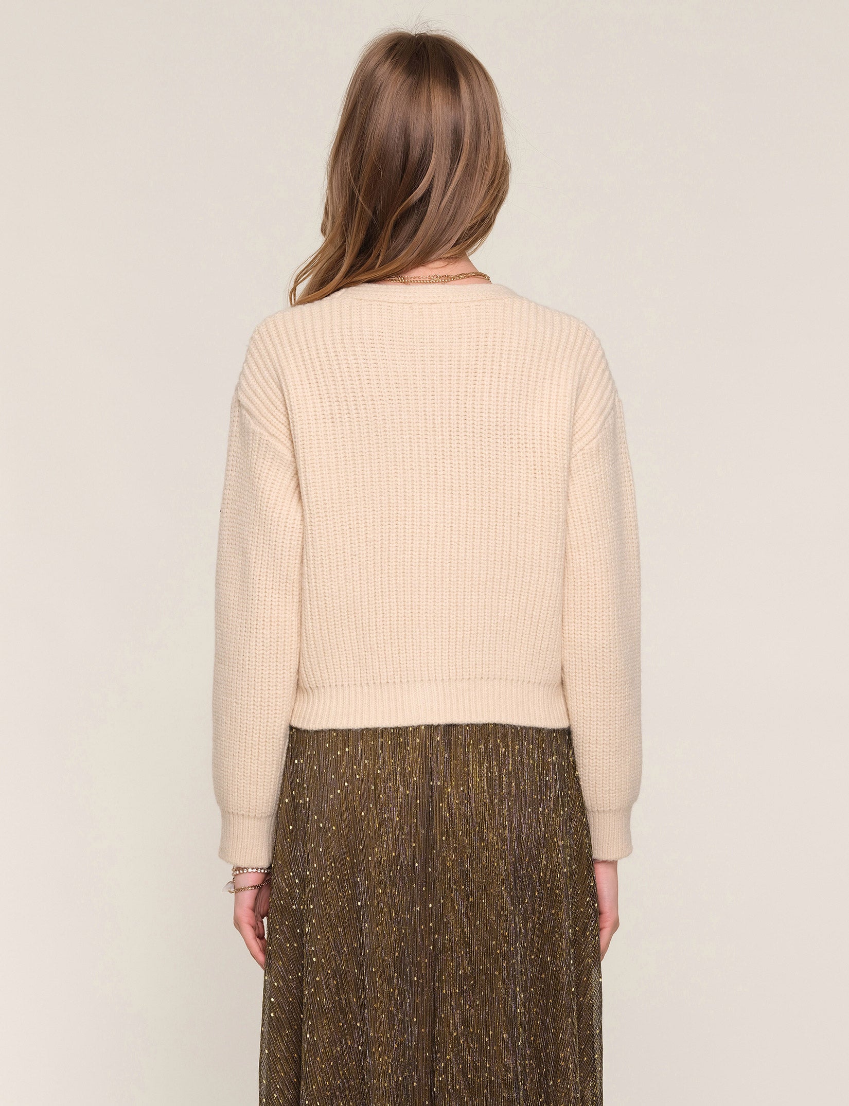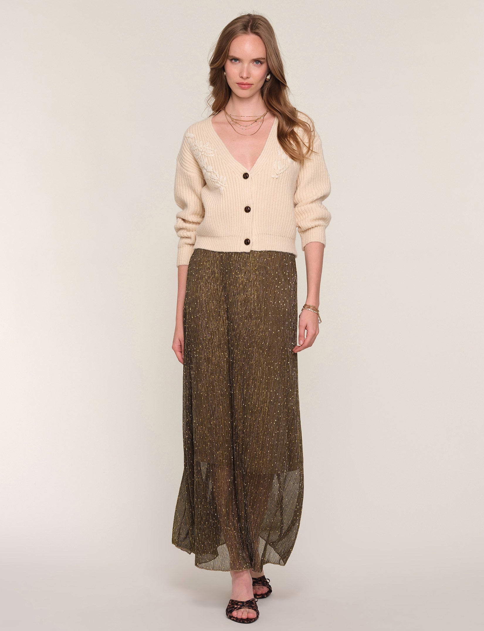 The Adelias Cardi is a v-neck, ribbed sweater with dropped shoulders and a relaxed fit. It features a pretty, floral embroidery at front body.
