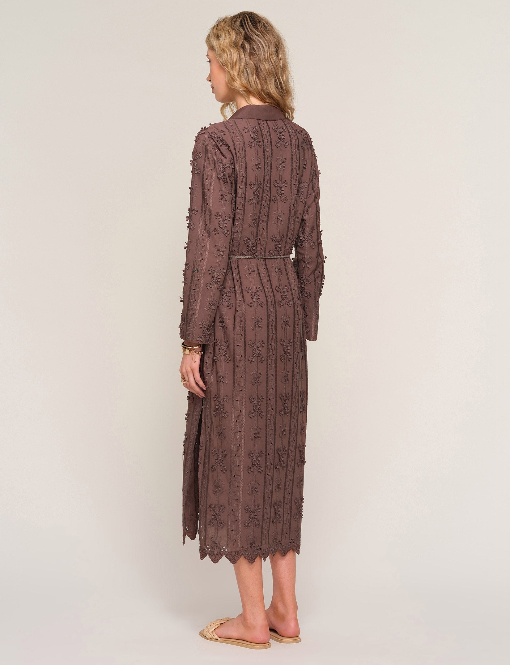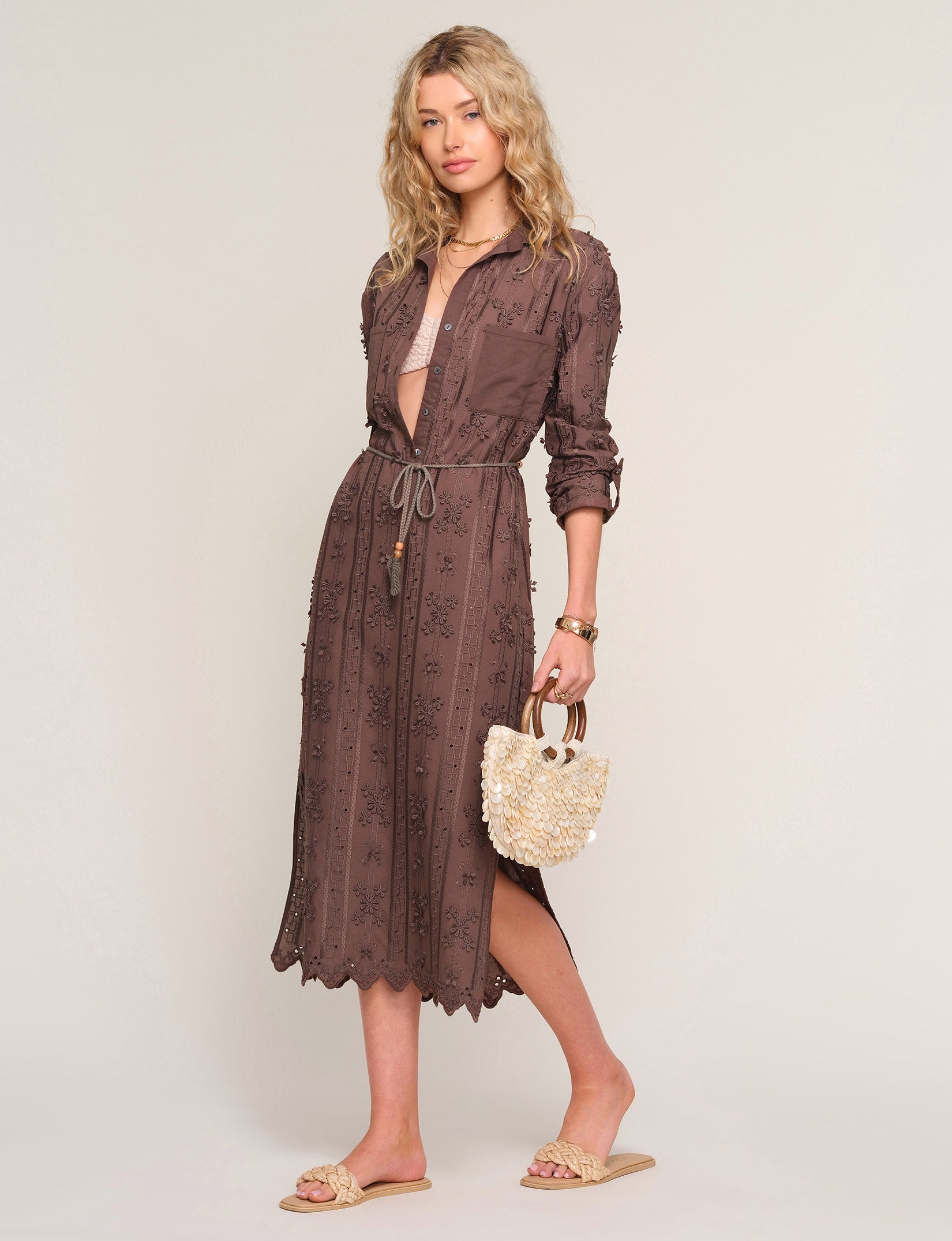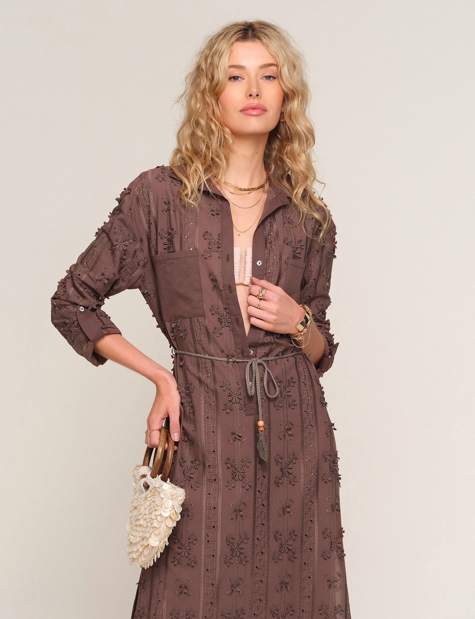 The Alia Cover-Up is a classic shirt dress made with an eyelet cotton lace fabric. It features a relaxed fit and a rope belt. Perfect for throwing on over any swimsuit.