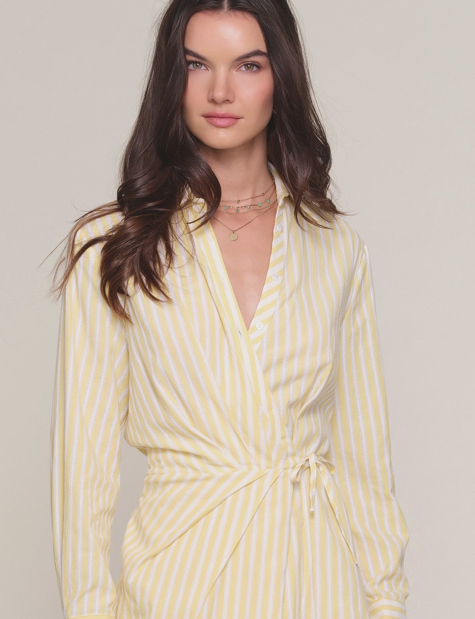 The Azaline Dress is made from a cotton stripe voile. It has a flattering wrap front and a slim fit. We love it paired with your favorite flip-flops.