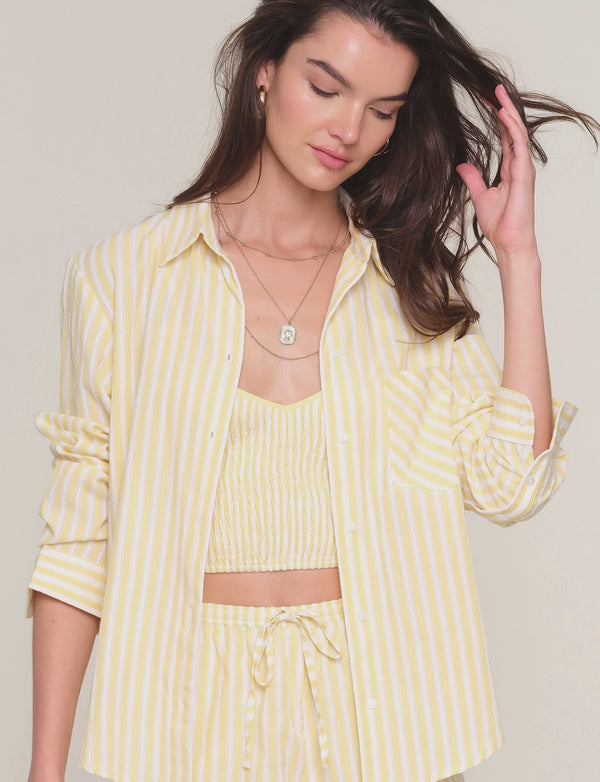 The Davi Three Piece is made from a cotton stripe and makes getting dressed easy. It has a fully smocked tank, that is layered under a relaxed fit button down. The shorts have an elastic waist for ultra comfort.