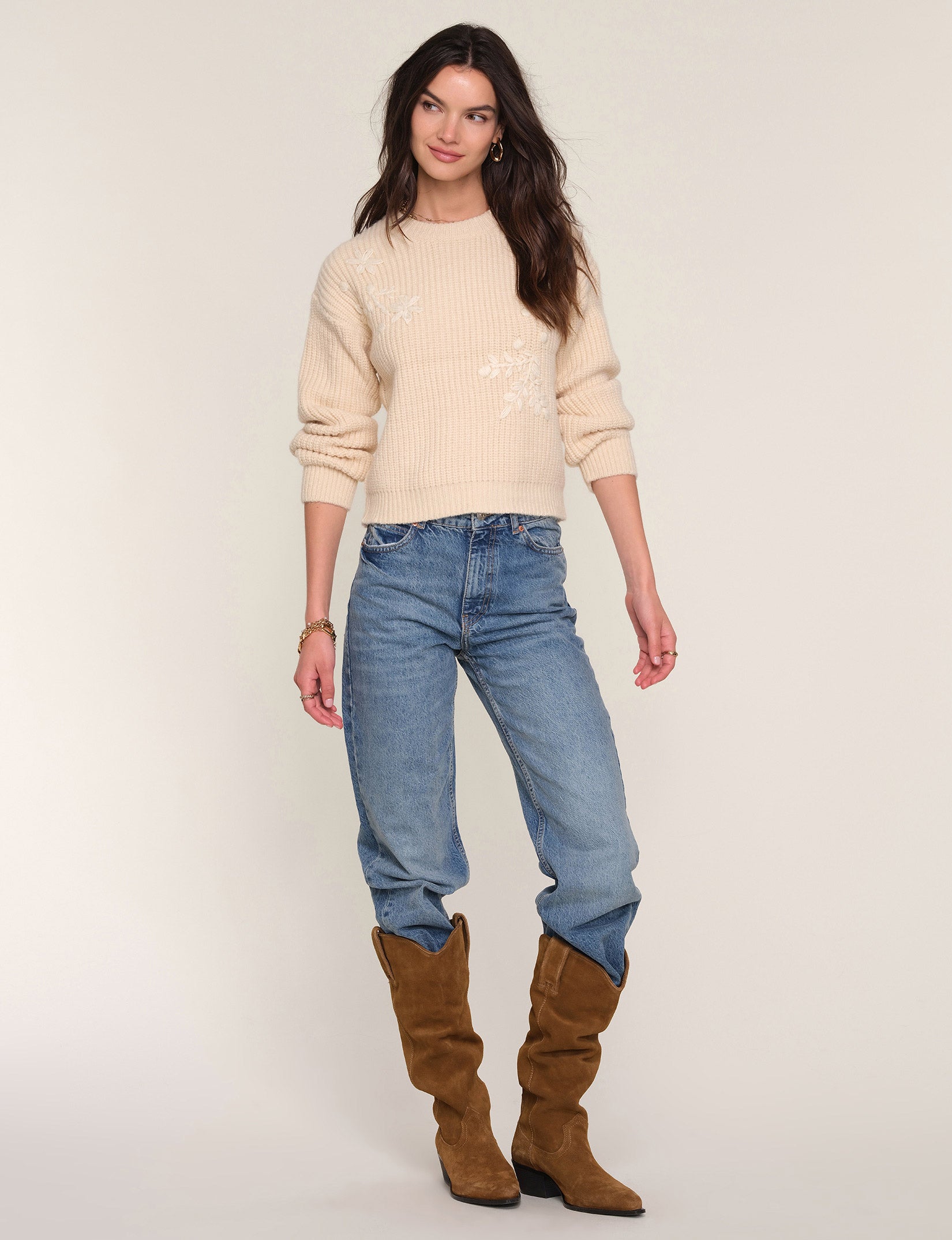 The Ellie Sweater is a cool, relaxed fit crew neck. It's made from a soft, ribbed knit and features floral embroidery at the front.