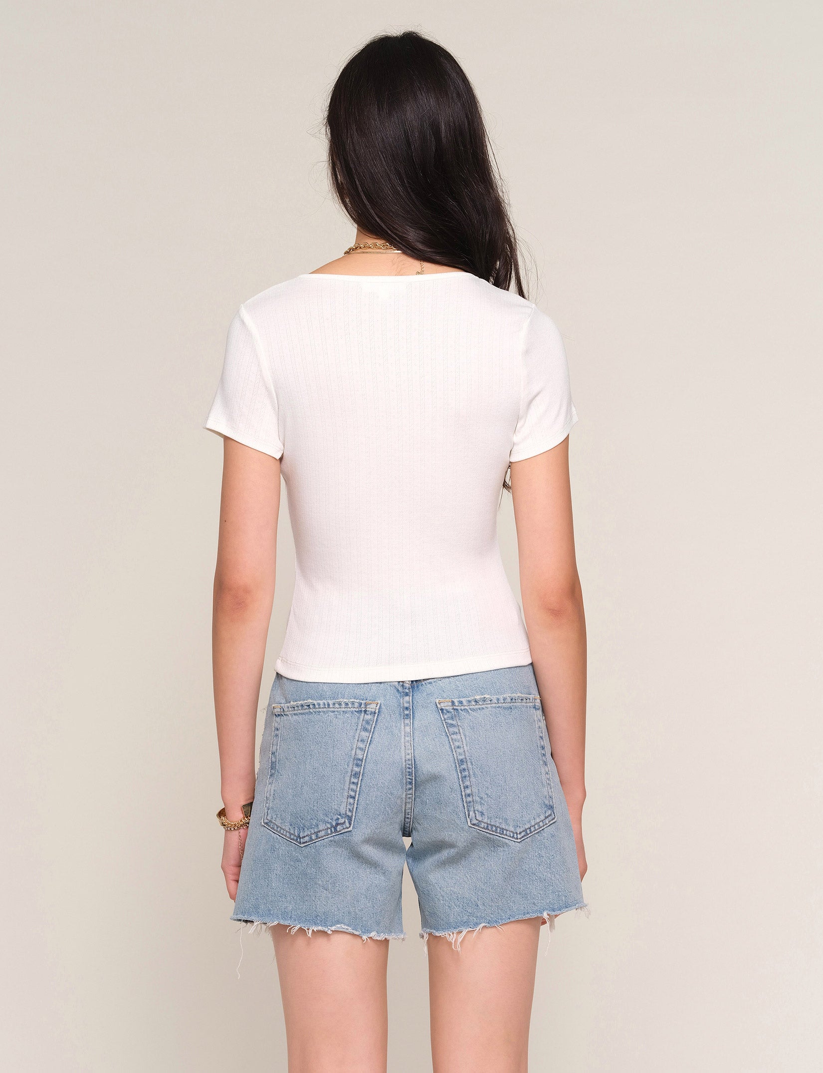 The Eloise Top is our favorite piece this season. It's a simple, cap sleeve tee made from a soft rib. It features cute, gingham bows down center front.