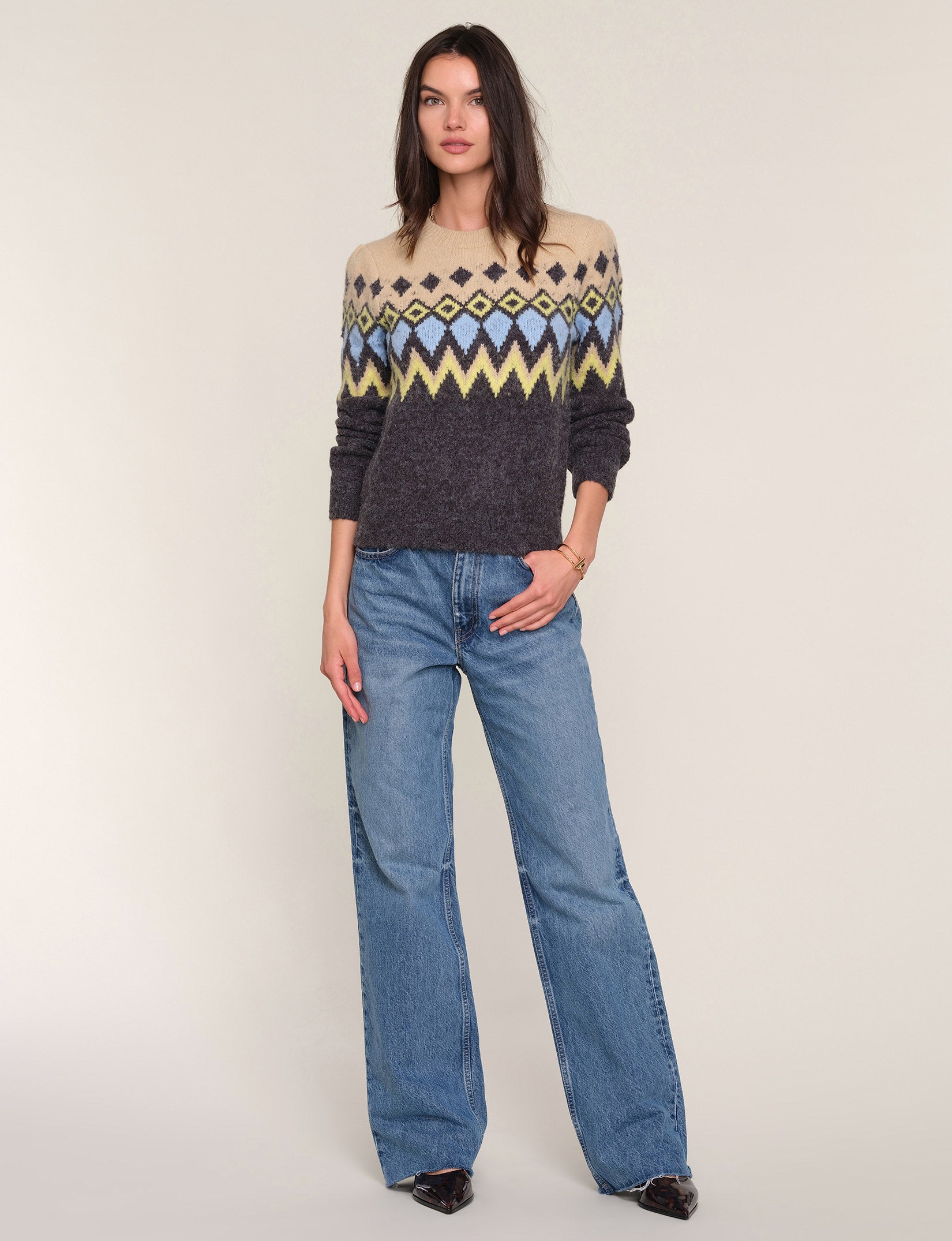 TheEmerie Sweater is a crew neck sweater, with a relaxed fit. It features a winter jacquard pattern across the chest.