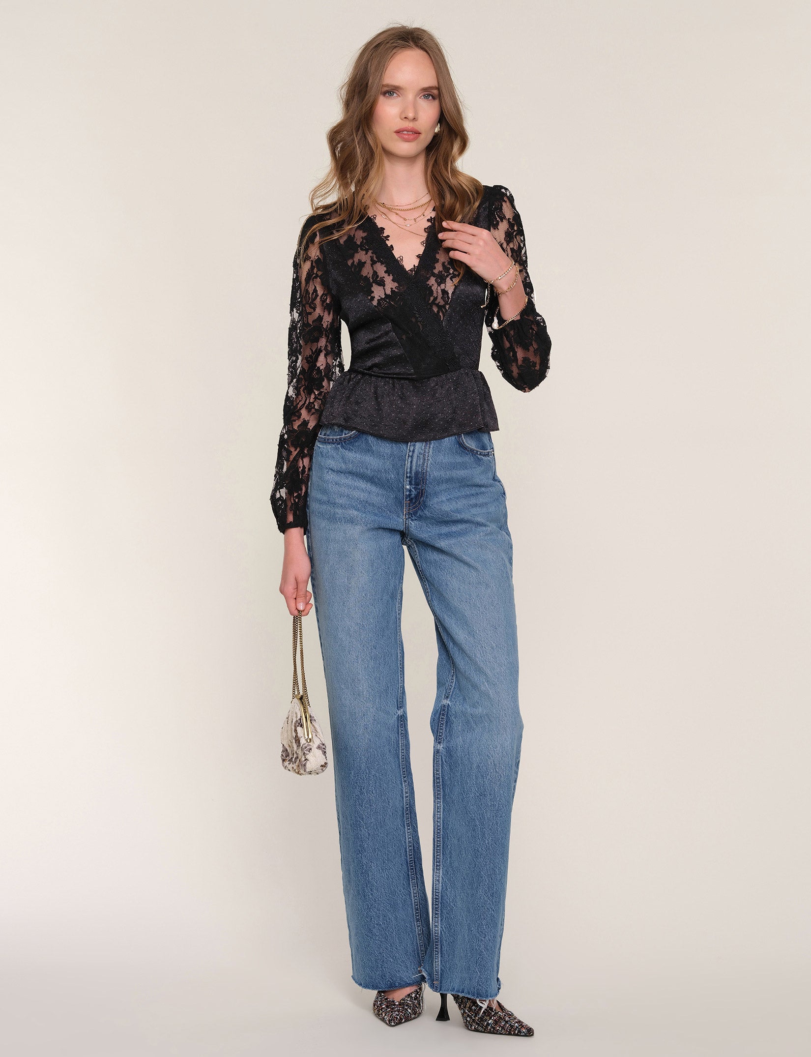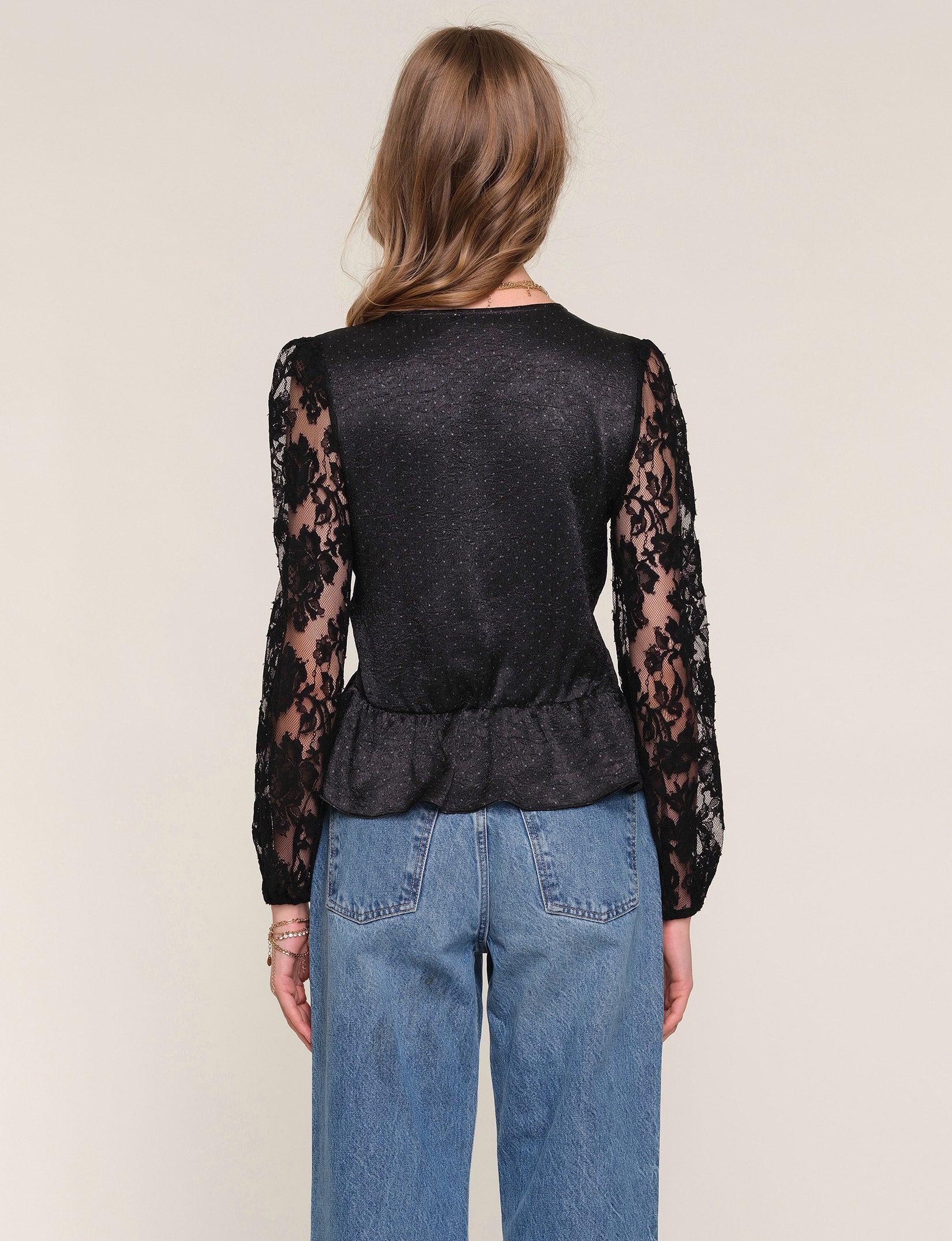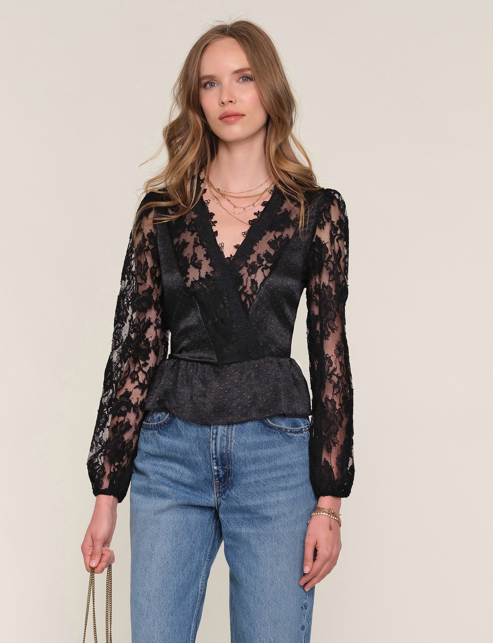 The Gita Top is a faux wrap, long sleeve blouse. It's made from a hammered satin and features lace sleeves and lace along the front neck.