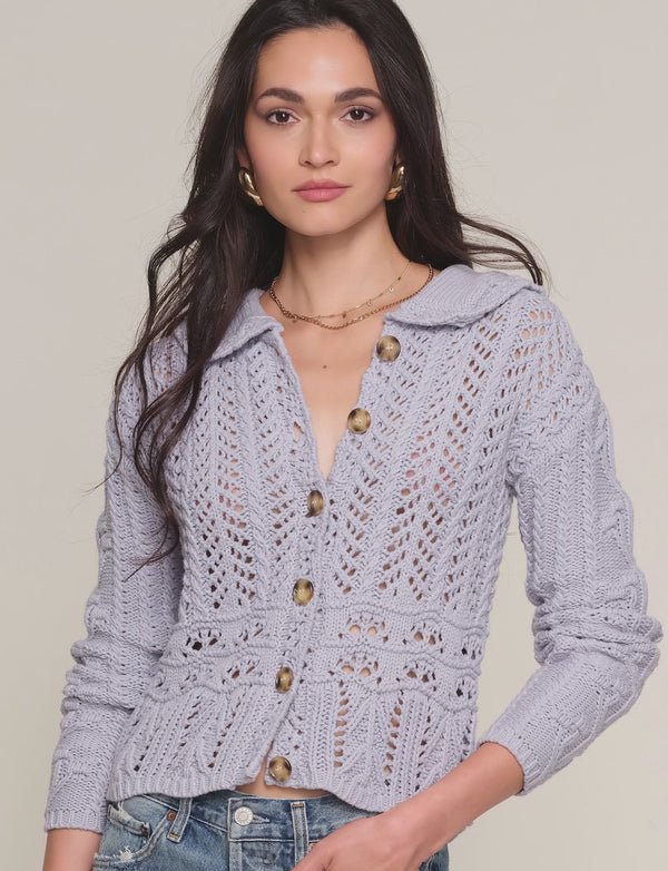 The Irine Cardi is an open stitch cardigan with a self collar. It features faux horn buttons and a relaxed fit.