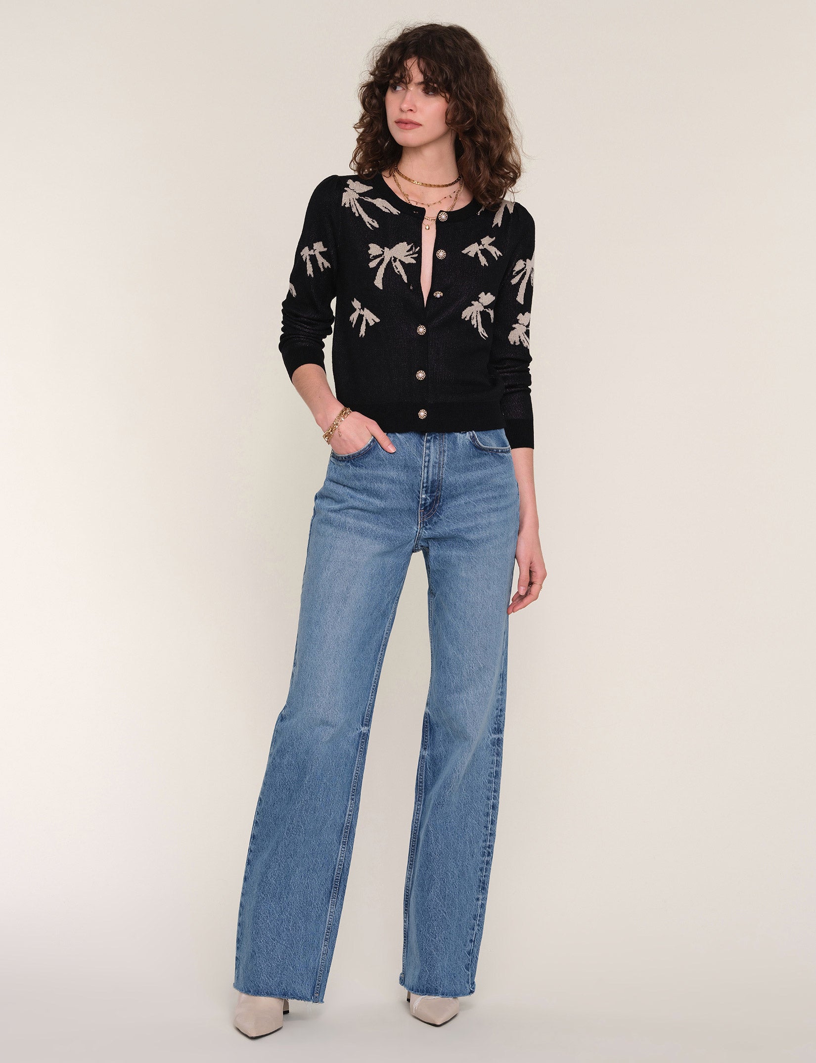 The Katari Cardi is a relaxed fit, light weight cardigan. It has a crew neck and novelty buttons down the front. It's made from a soft knit with jacquard bows thoughout the body. Pair with denim for an effortlessly, cool look.