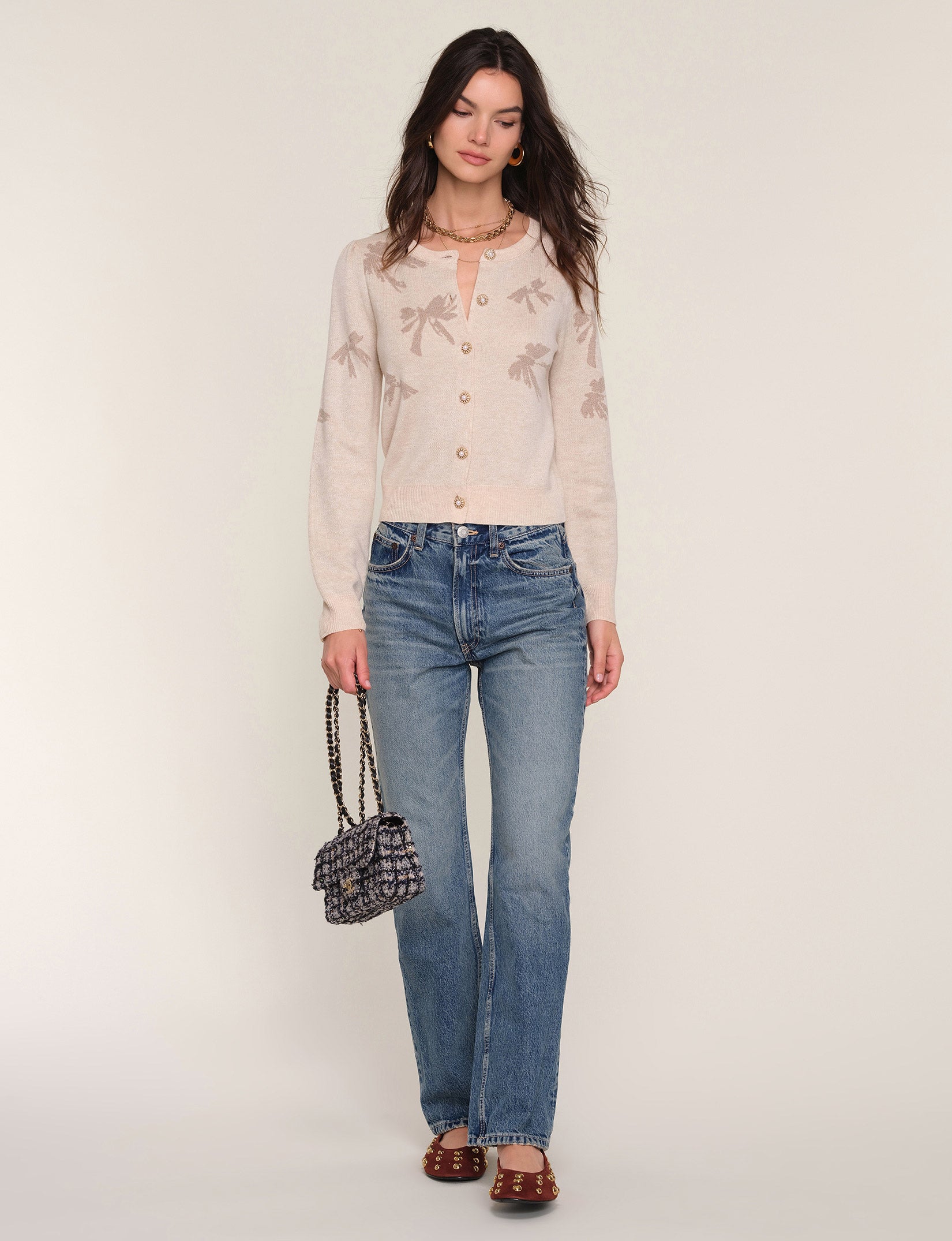 The Katari Cardi is a relaxed fit, light weight cardigan. It has a crew neck and novelty buttons down the front. It's made from a soft knit with jacquard bows thoughout the body. Pair with denim for an effortlessly, cool look.