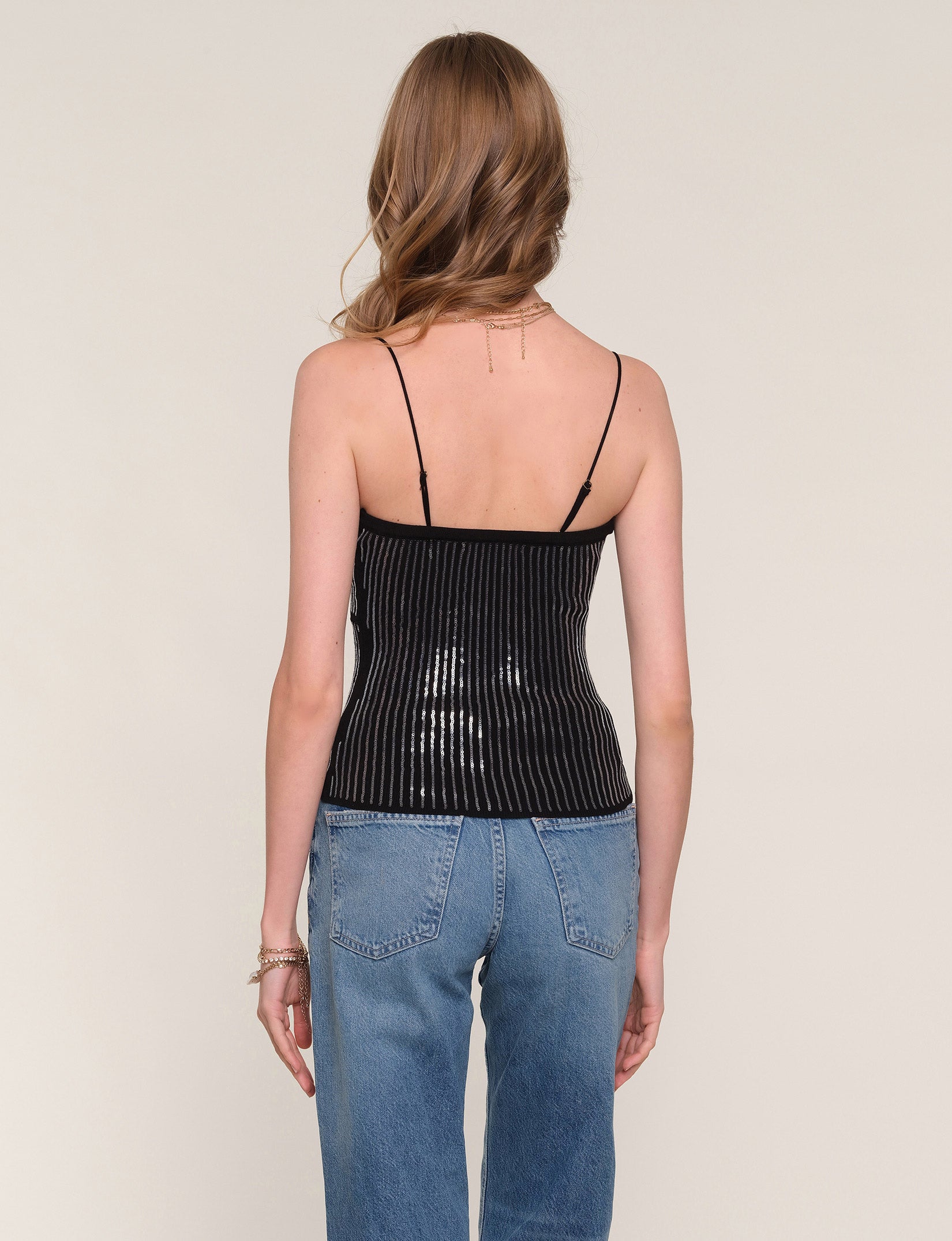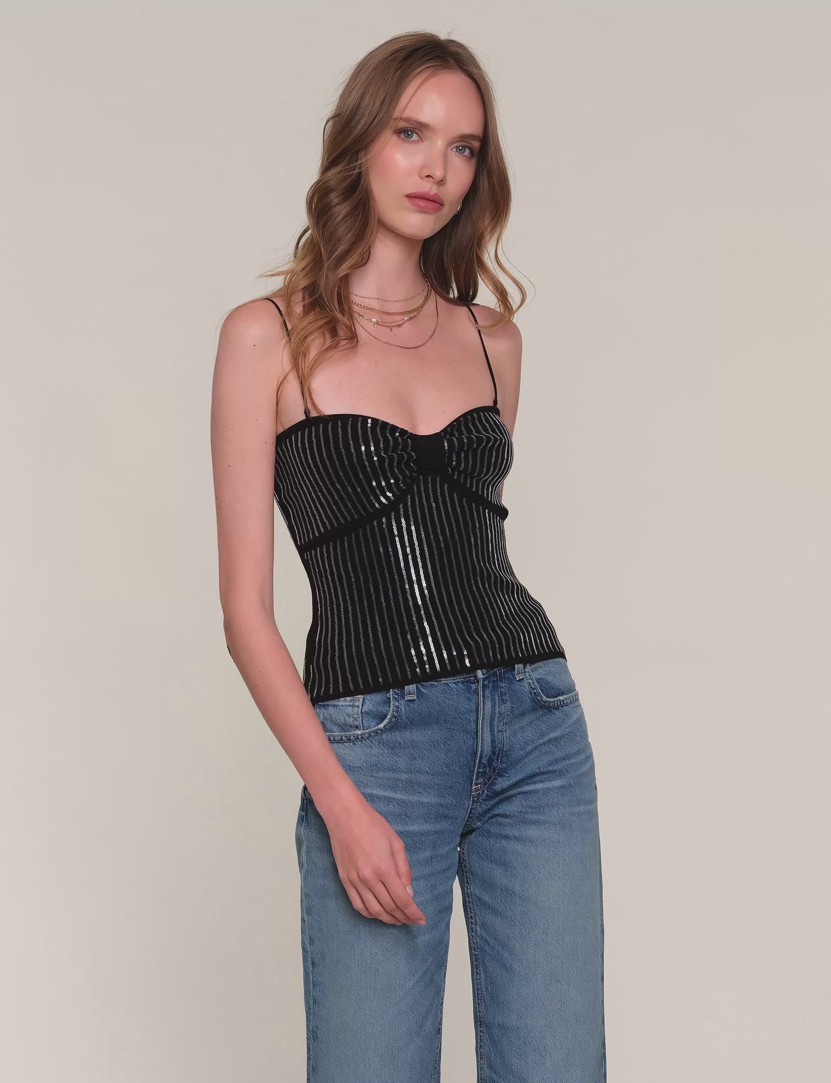 The Kelsa Cami is a Heartloom staple. A knit cami with a bow front detail, covered in sequins. It has a slim fit and adjustable straps. We love it simply paired with jeans.