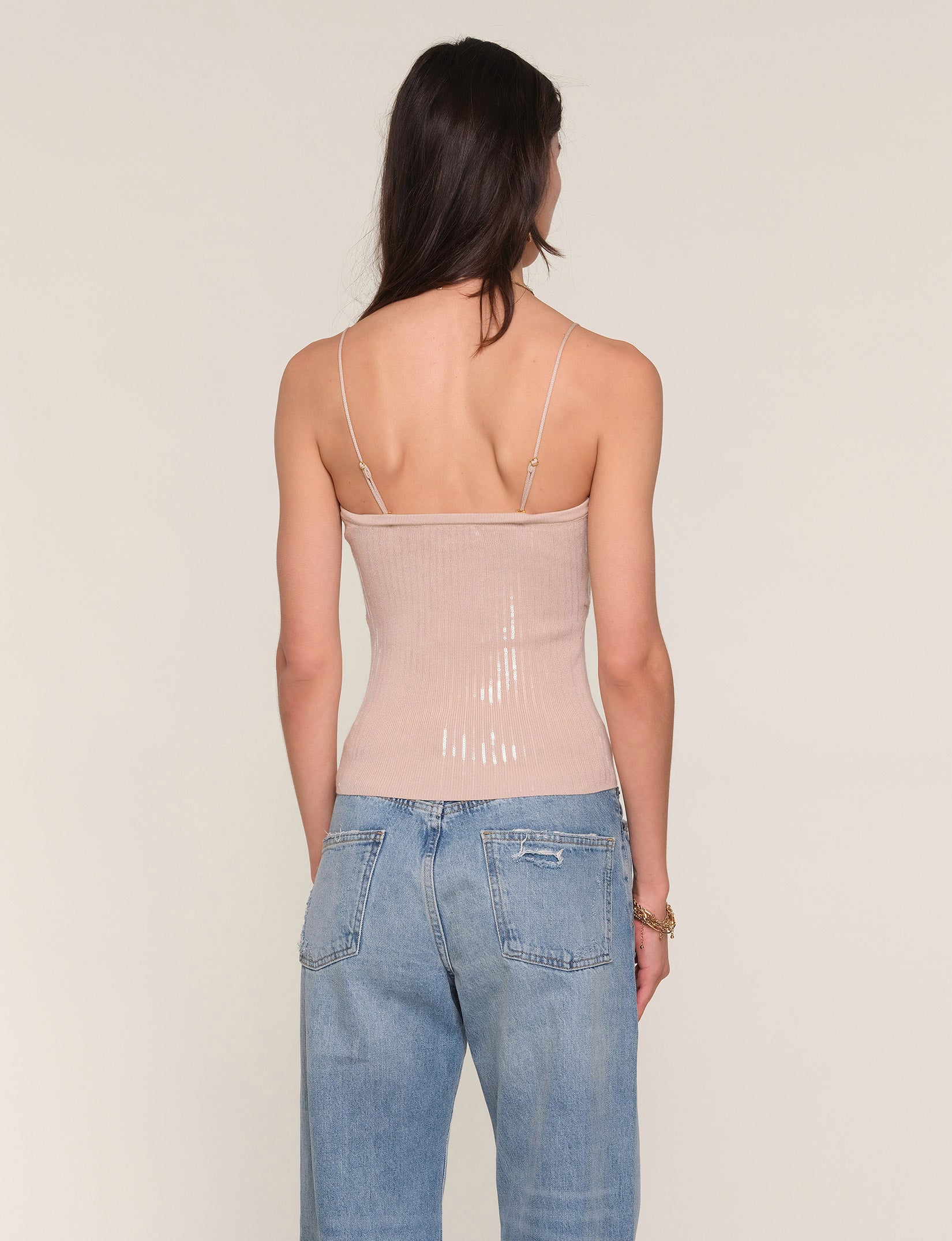 The Kelsa Cami is a Heartloom staple. A knit cami with a bow front detail, covered in sequins. It has a slim fit and adjustable straps. We love it simply paired with jeans.