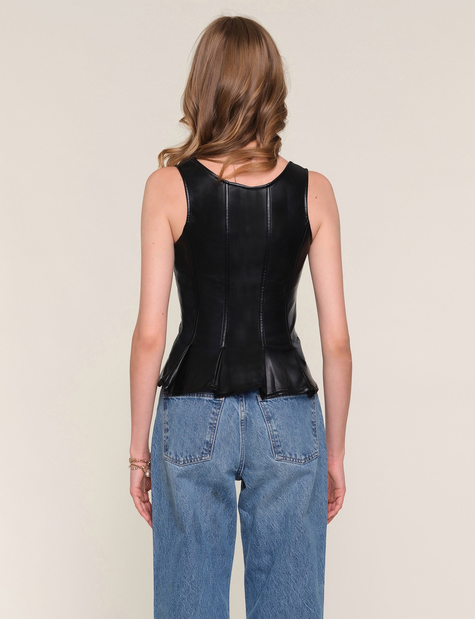 The Larosey Top is made from a faux leather. It features seamed details that release at the waist creating a flared hem.