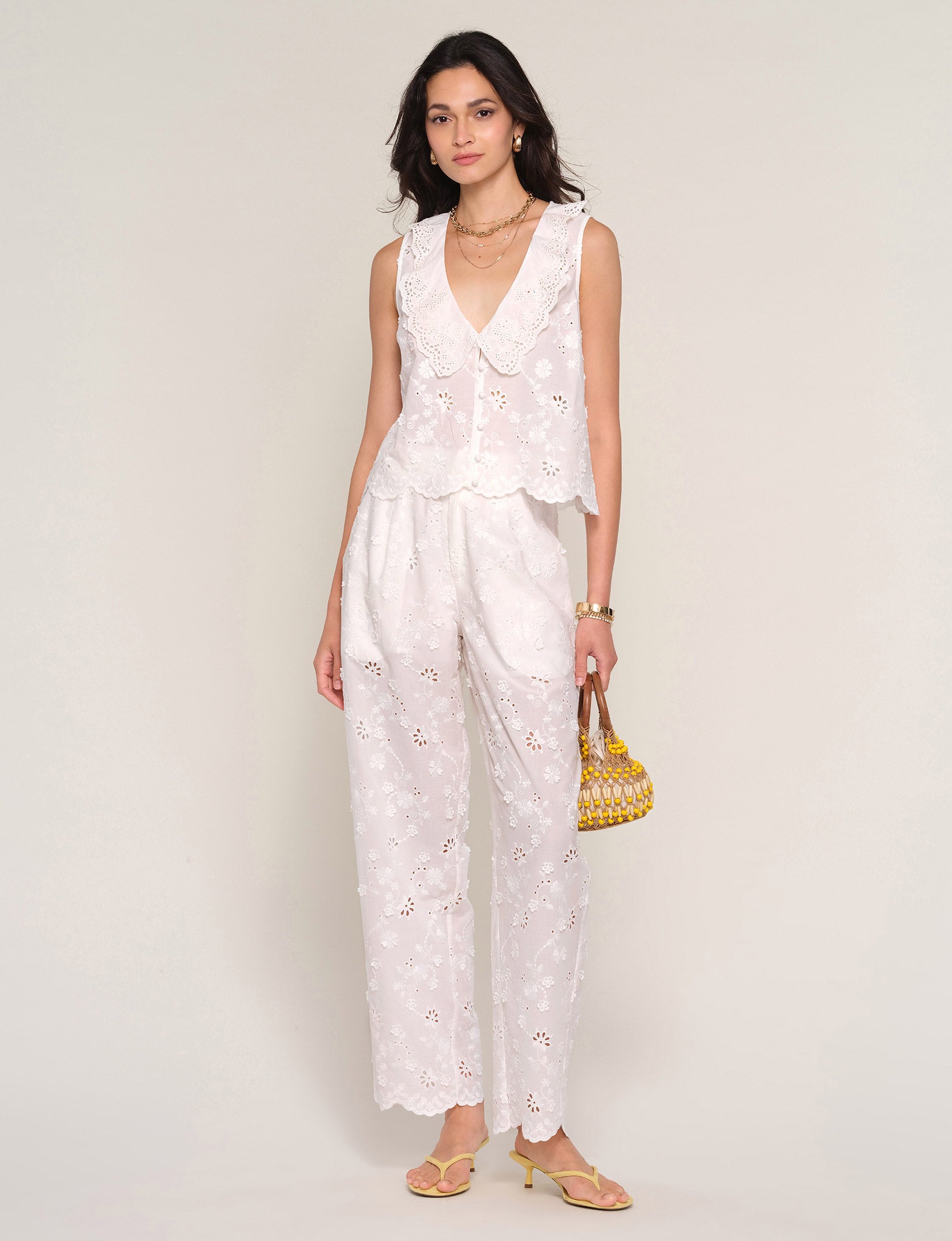 The Lili Pant is our favorite fit pant. It sits at your natural waist, has a straight, relaxed leg, and hits at the ankle bone. Made from a cotton eyelet with floral embroidery, these really stand out.