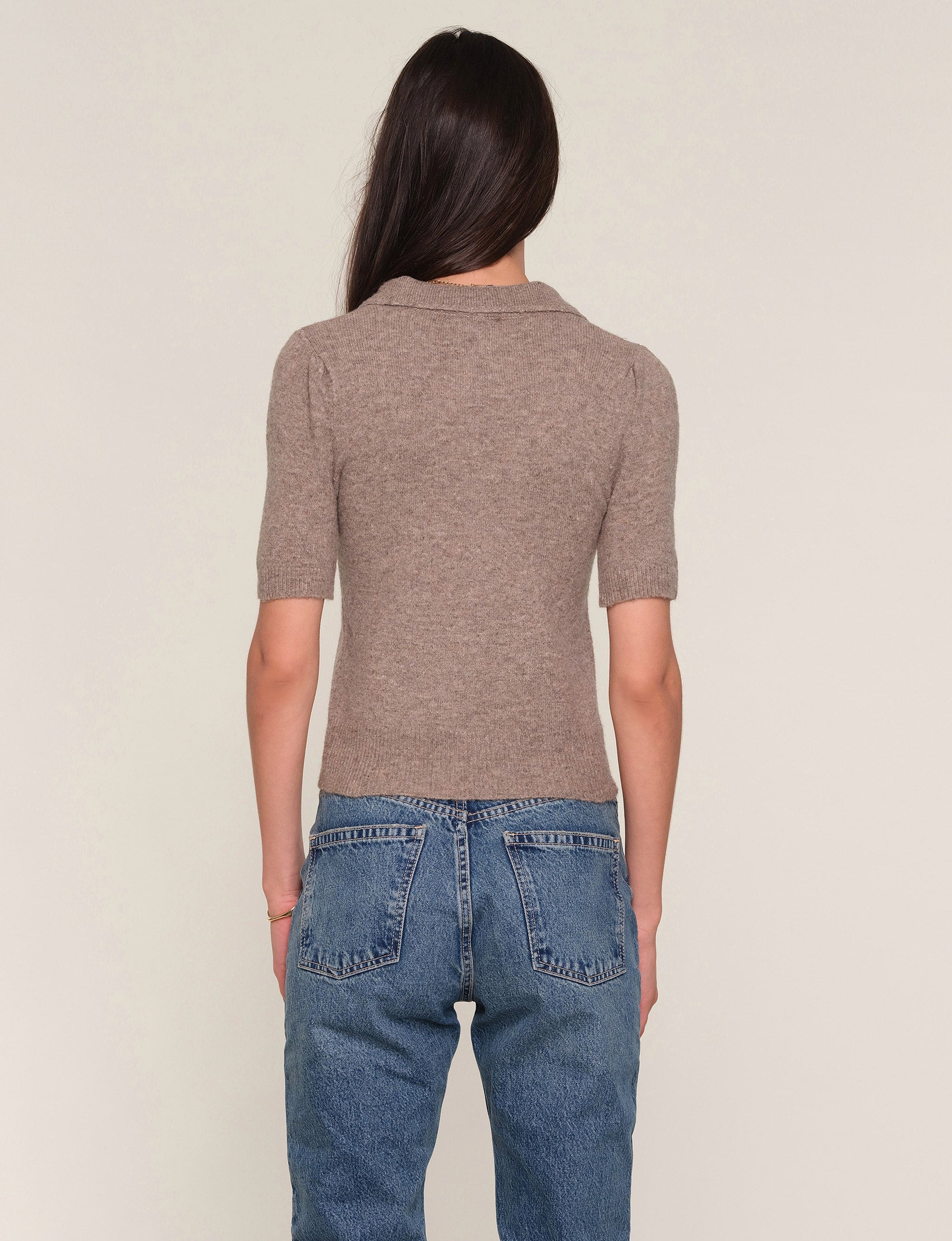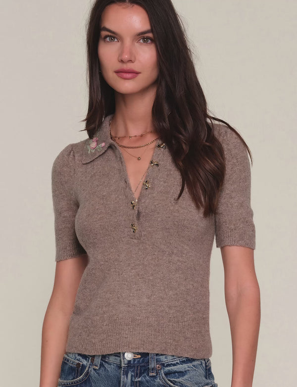 The Liza Top is a soft, polo knit. It has a slim fit and features a floral embroidery at collar tips.