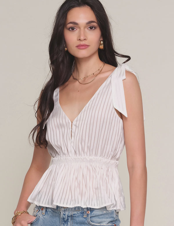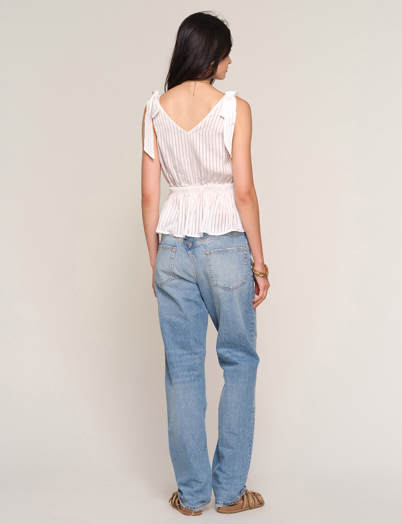 The Loulou Top is made from a pinstripe satin. It has a self ties at the shoulders and an elastic waist.