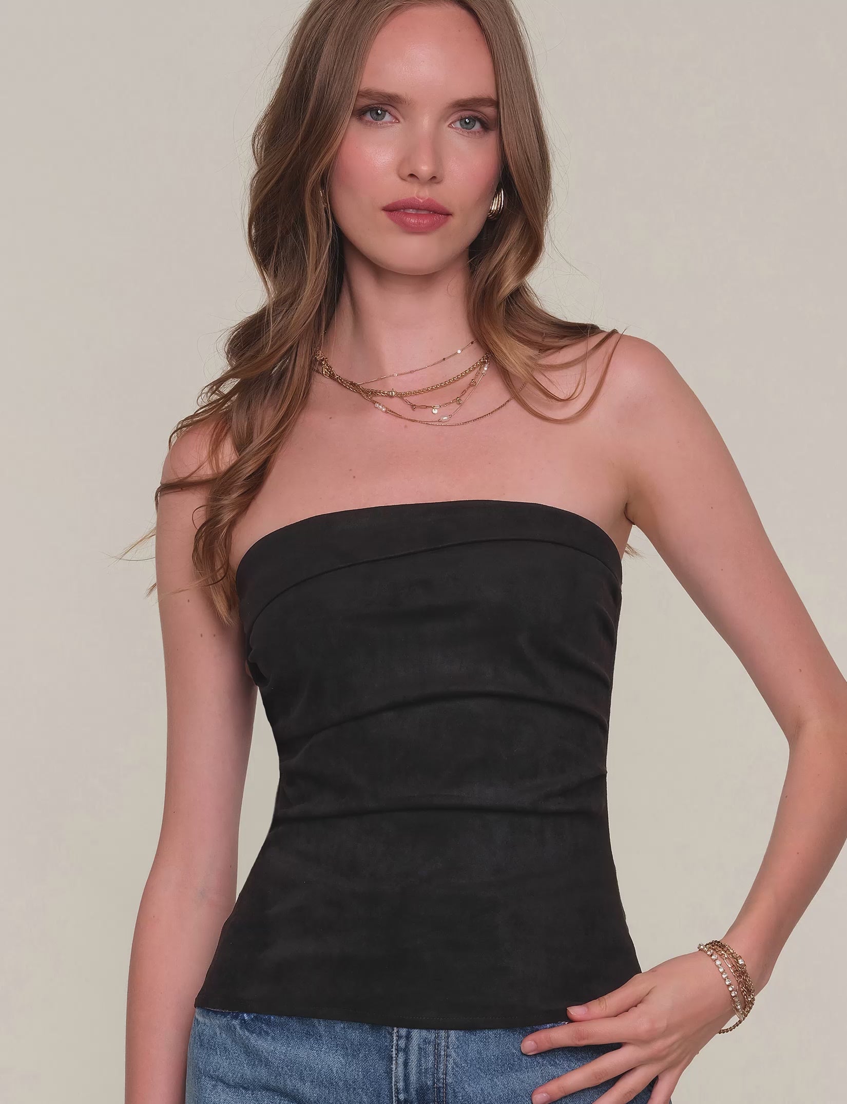 The Marinette Top is a strapless, faux suede top with a slim fit. It features pleats at side seam and a knit back for a super flattering look.