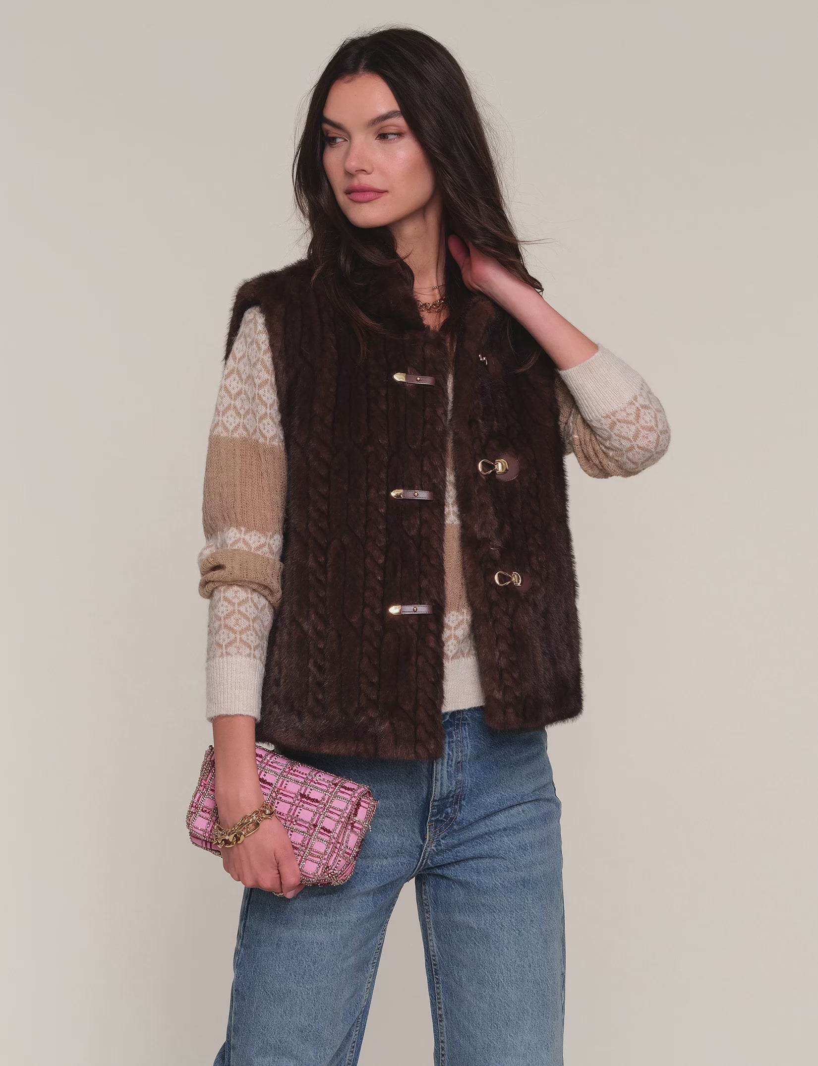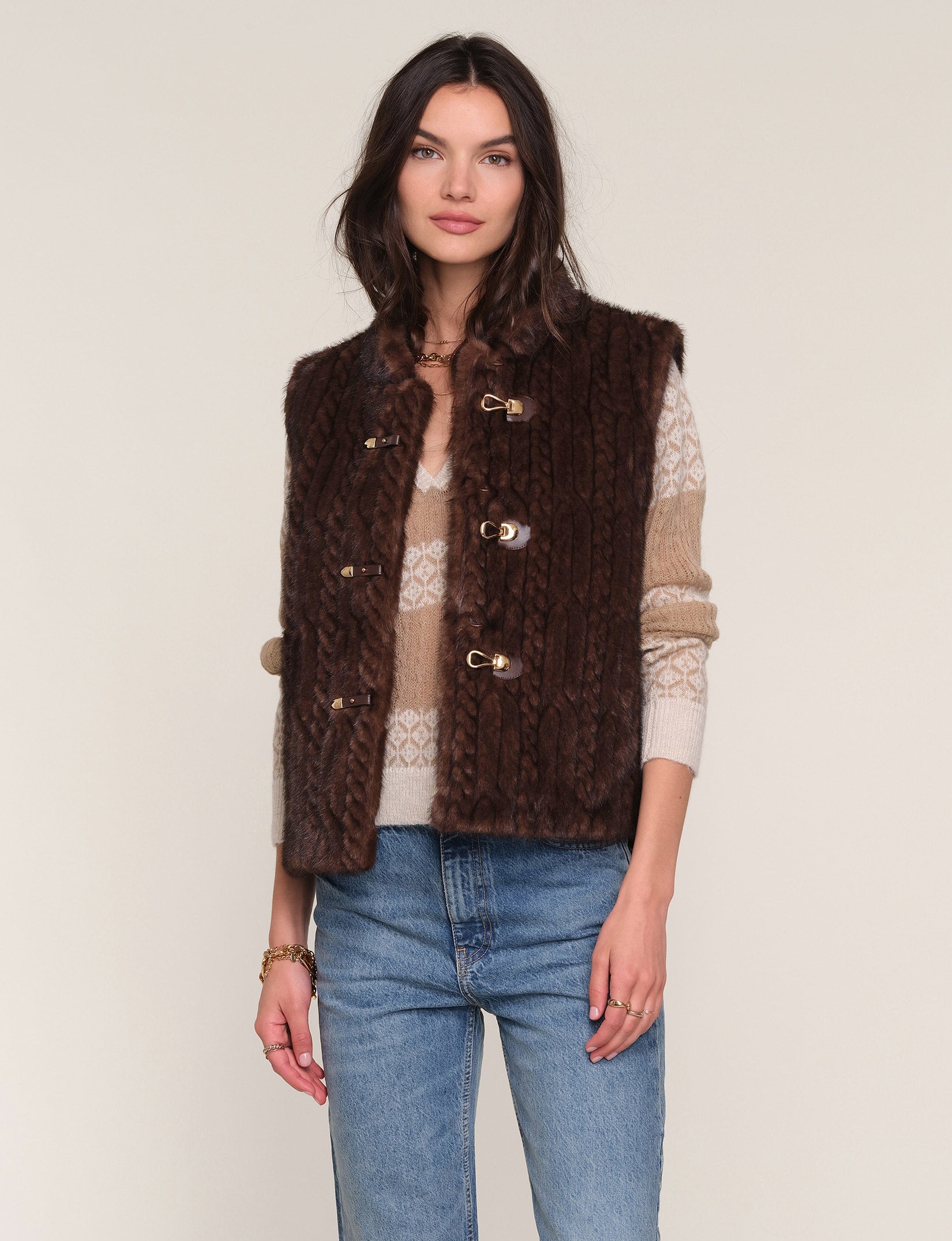 The Nancy Vest is made from a cable-look, faux fur. It features a relaxed fit and novelty hook & eye closure. Perfect for layering over your favorite sweater.