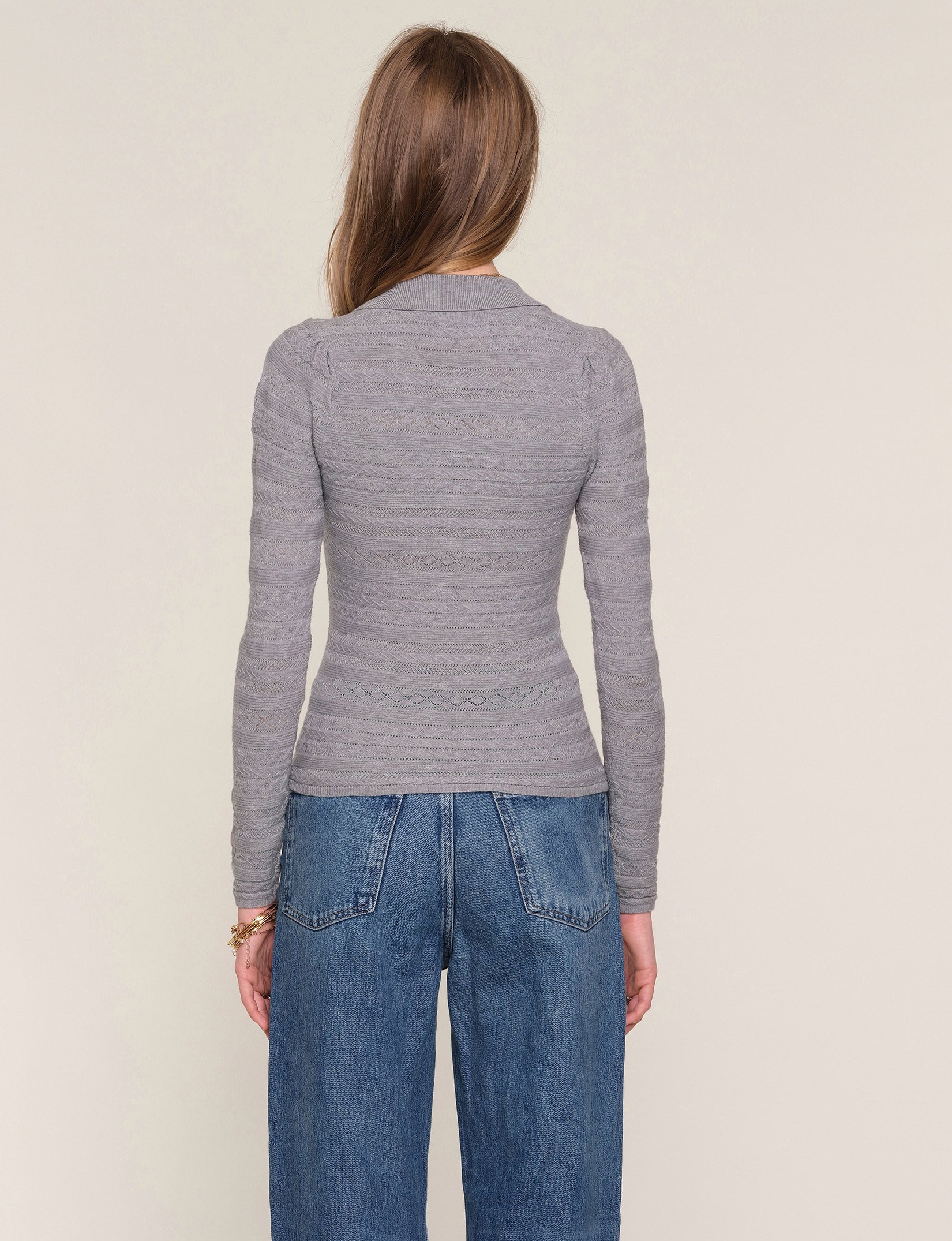 The Romero Top is a slim fit, polo top. It's made from a delicate pointelle and features novelty pearl buttons and a self collar.