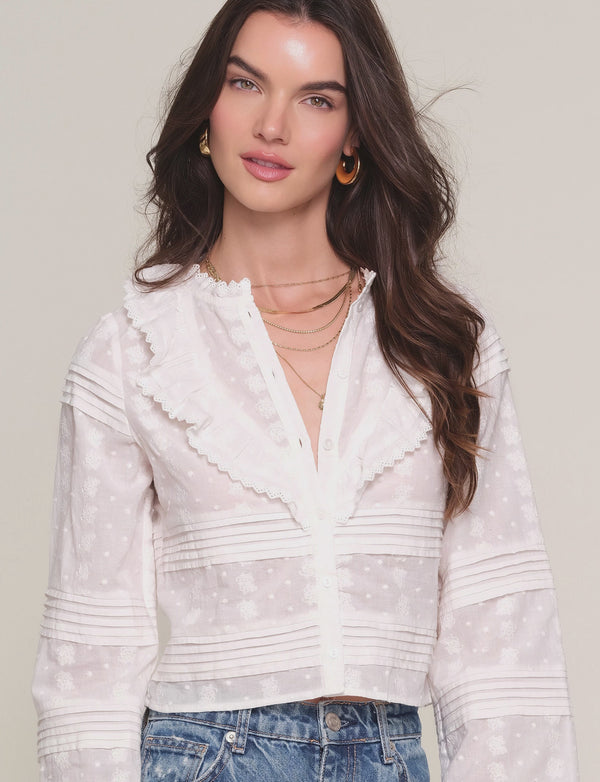 The Romy Top is a cool, long sleeve blouse with a relaxed fit. It features a pintucks and pretty, scalloped edges.