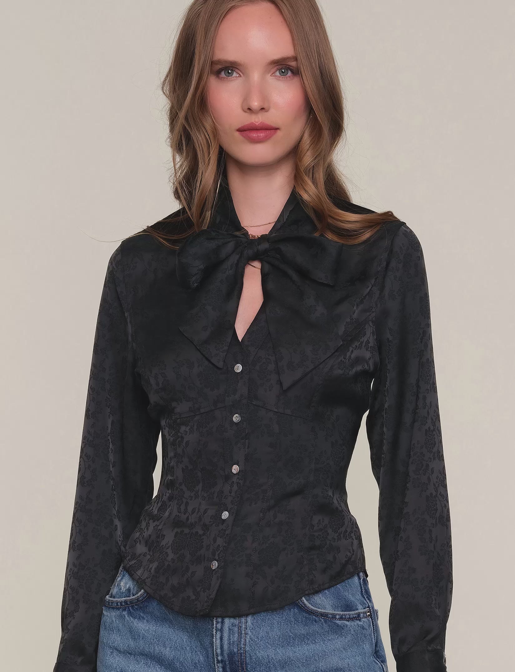 The Rosalind Top is made from a jacquard satin. It features a slim fit, button front and self tie at neck. We love it tucked in to high waist denim.