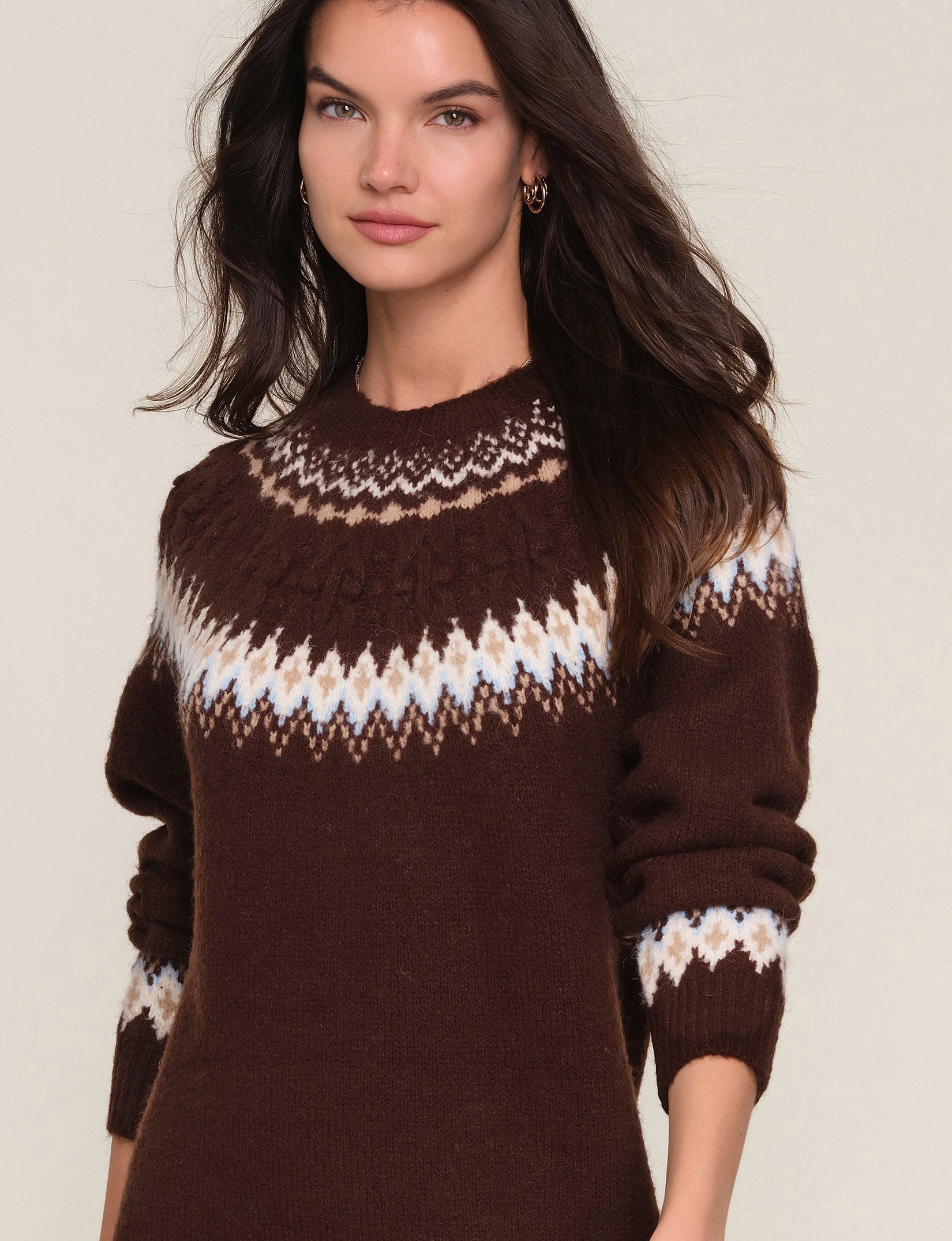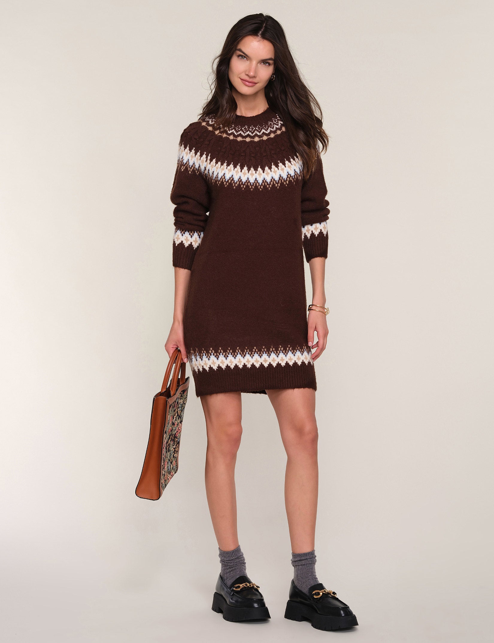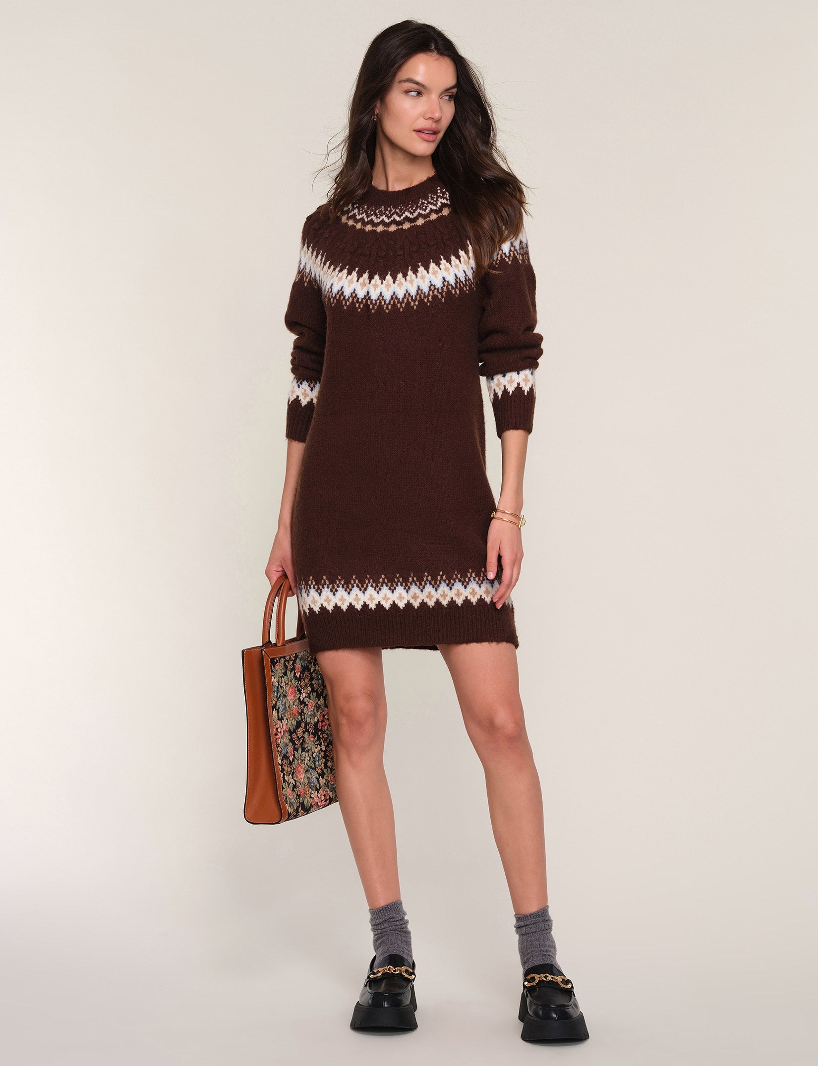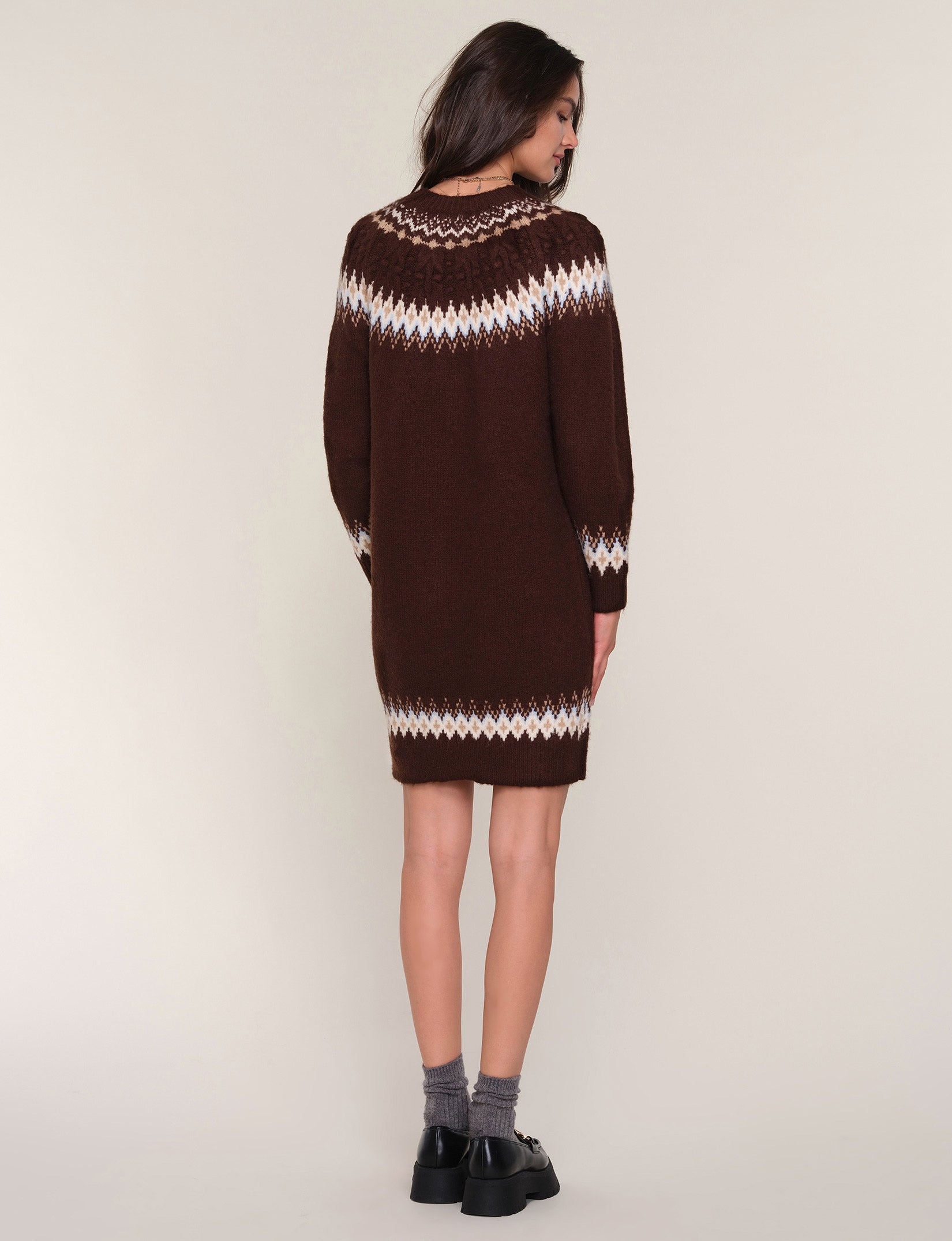 The Ruby Dress is a crew neck, relaxed fit, sweater dress. It features a novelty, winter pattern around the neck, cuffs and hem. We love it with chunky boots for ultimate cozy-girl vibes.