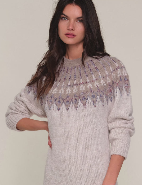 The Ruthie Dress is a cozy, crew-neck sweater dress. It has a relaxed fit and features a winter jacquard pattern around the shoulders and at the hem.
