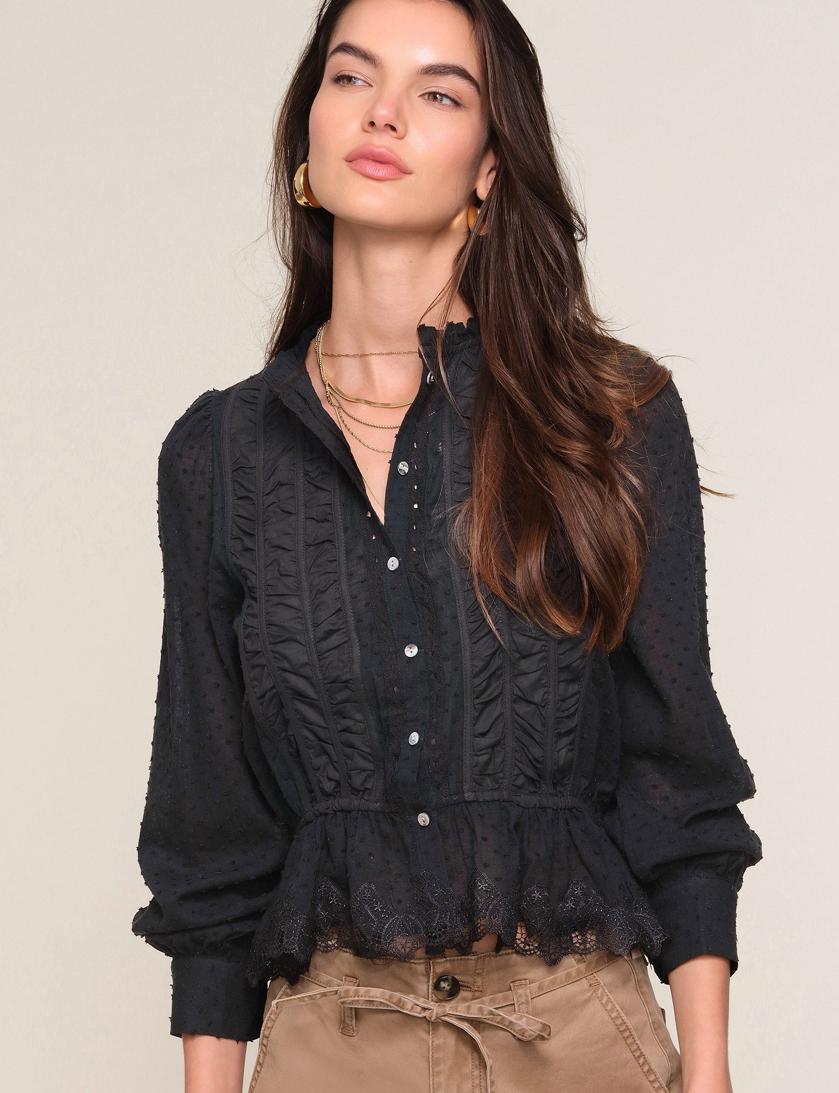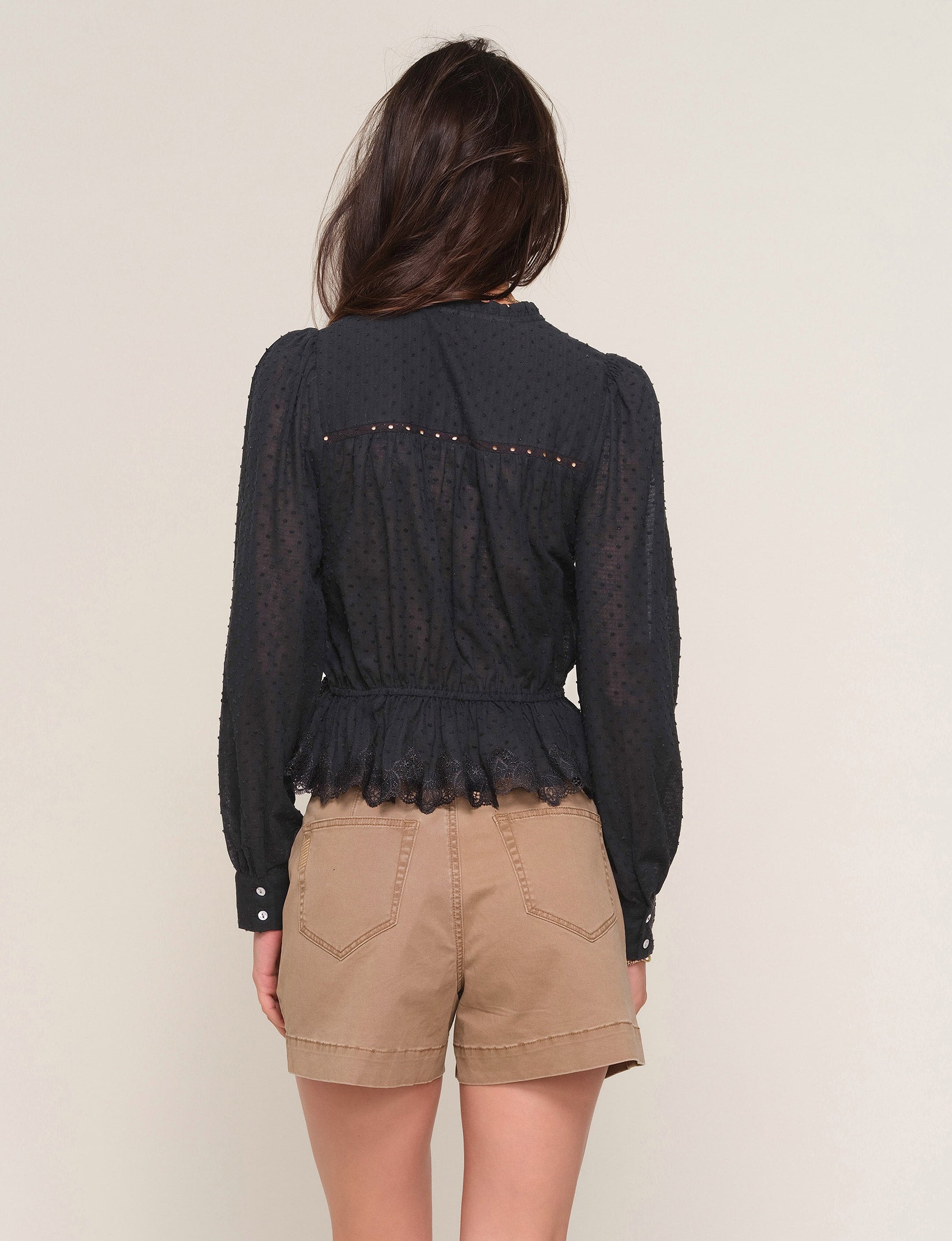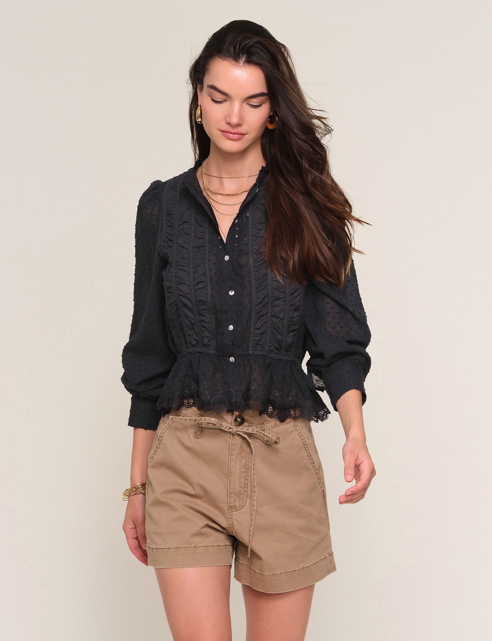 The Saya Top is a crew neck, button down shirt made from a soft, washed, cotton voile. It features an elastic waist, lace trim and shirred detail.