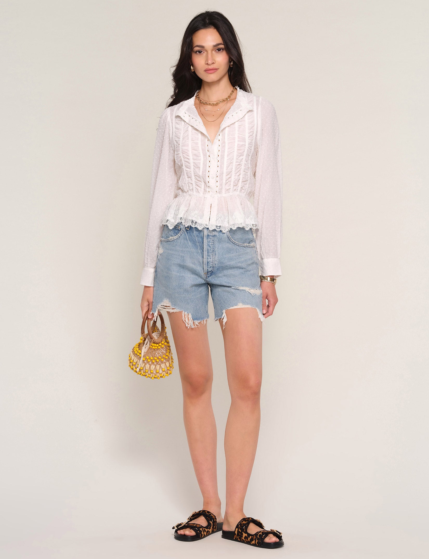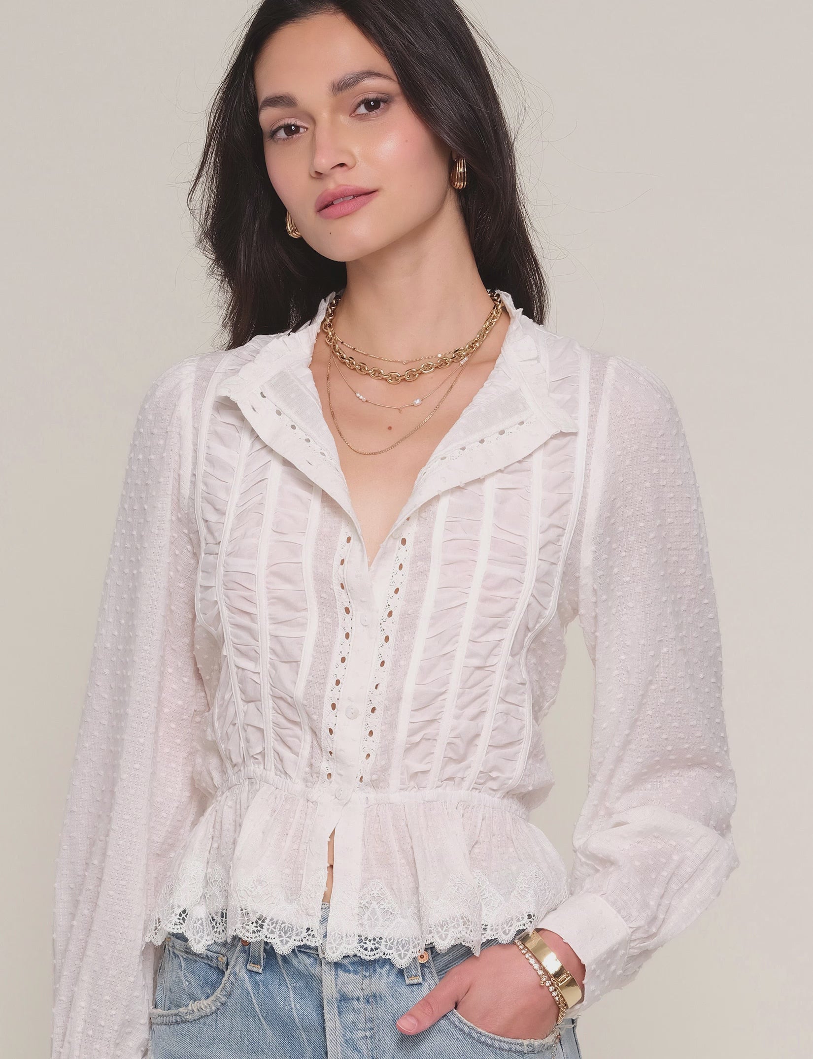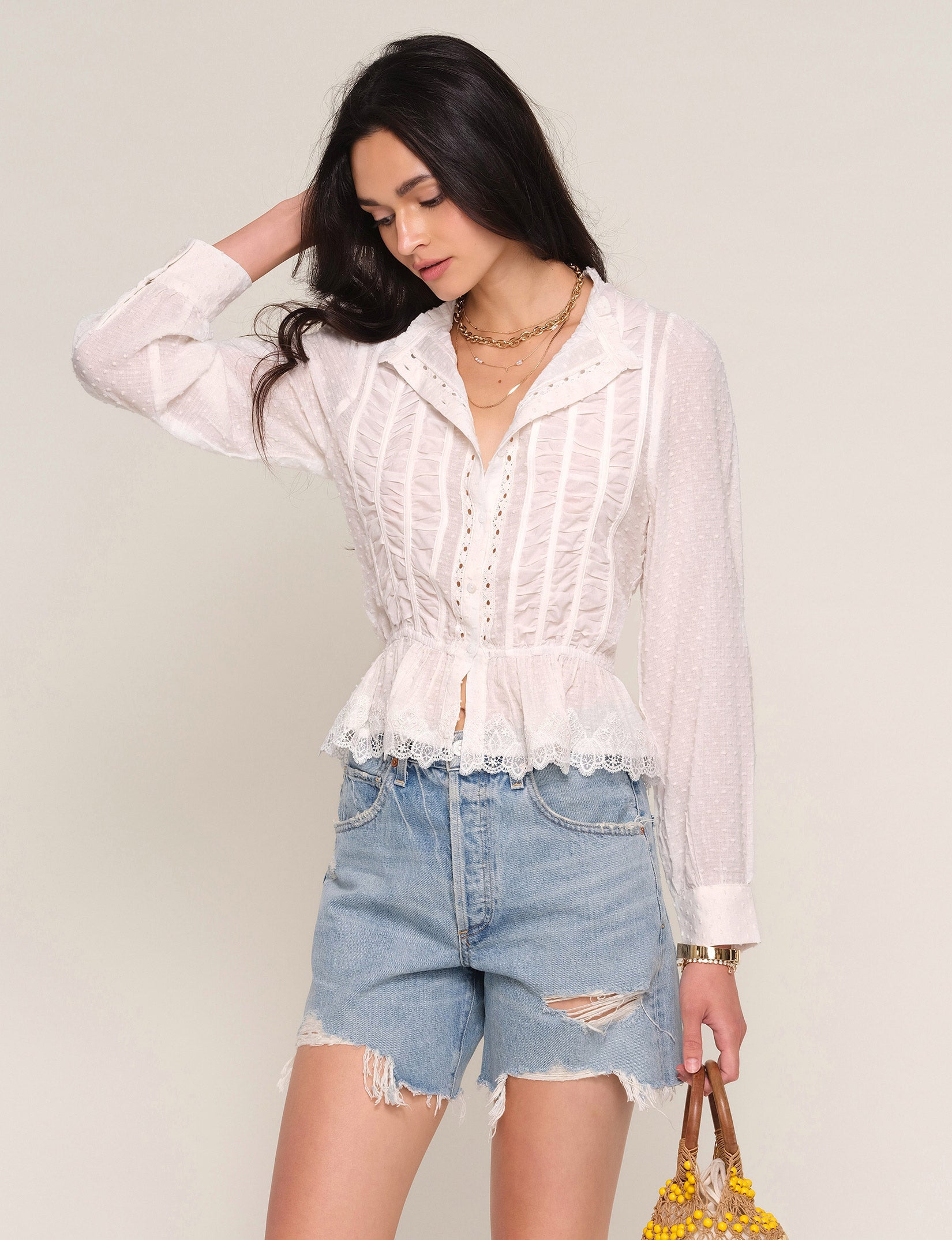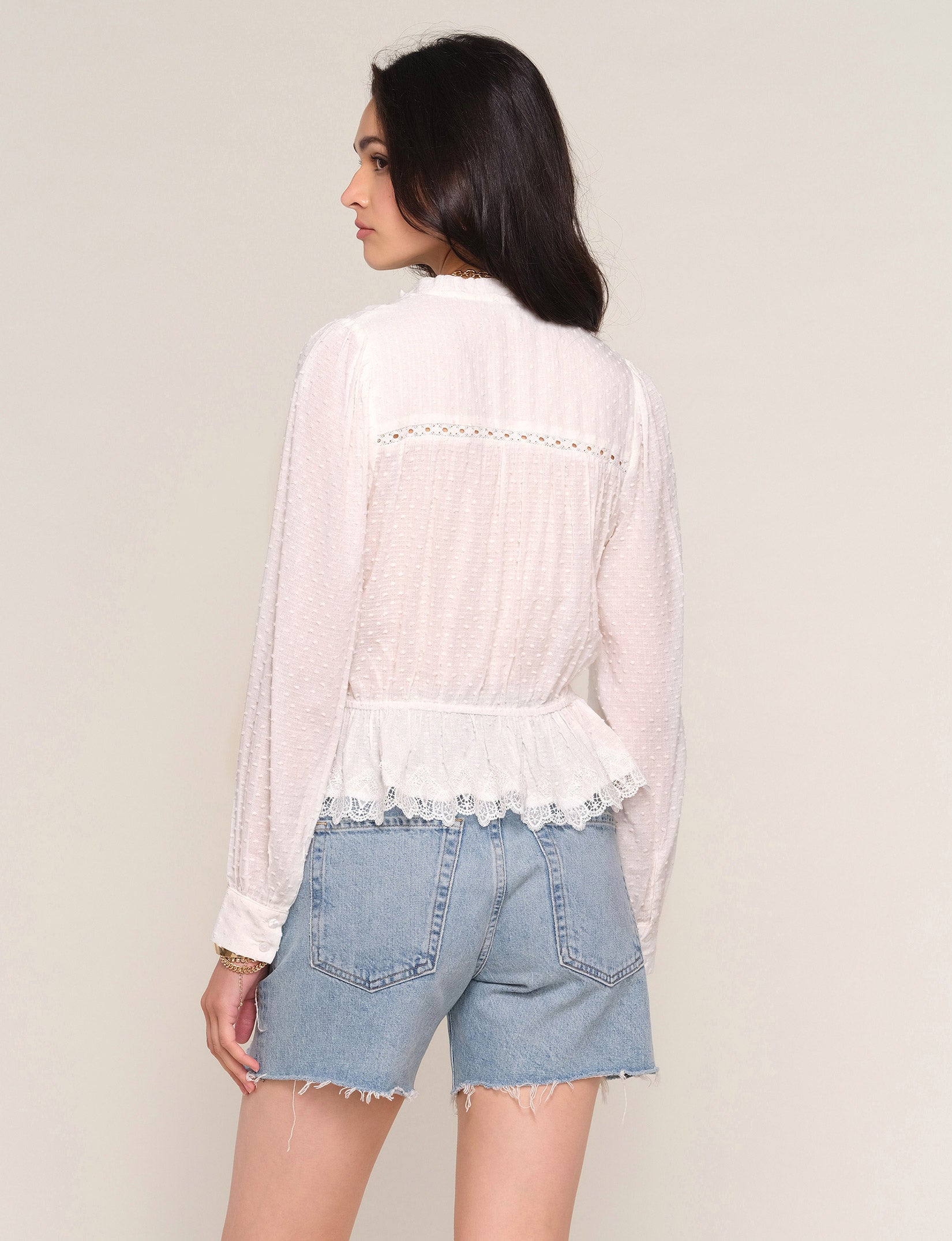 The Saya Top is a crew neck, button down shirt made from a soft, washed, cotton voile. It features an elastic waist, lace trim and shirred detail.