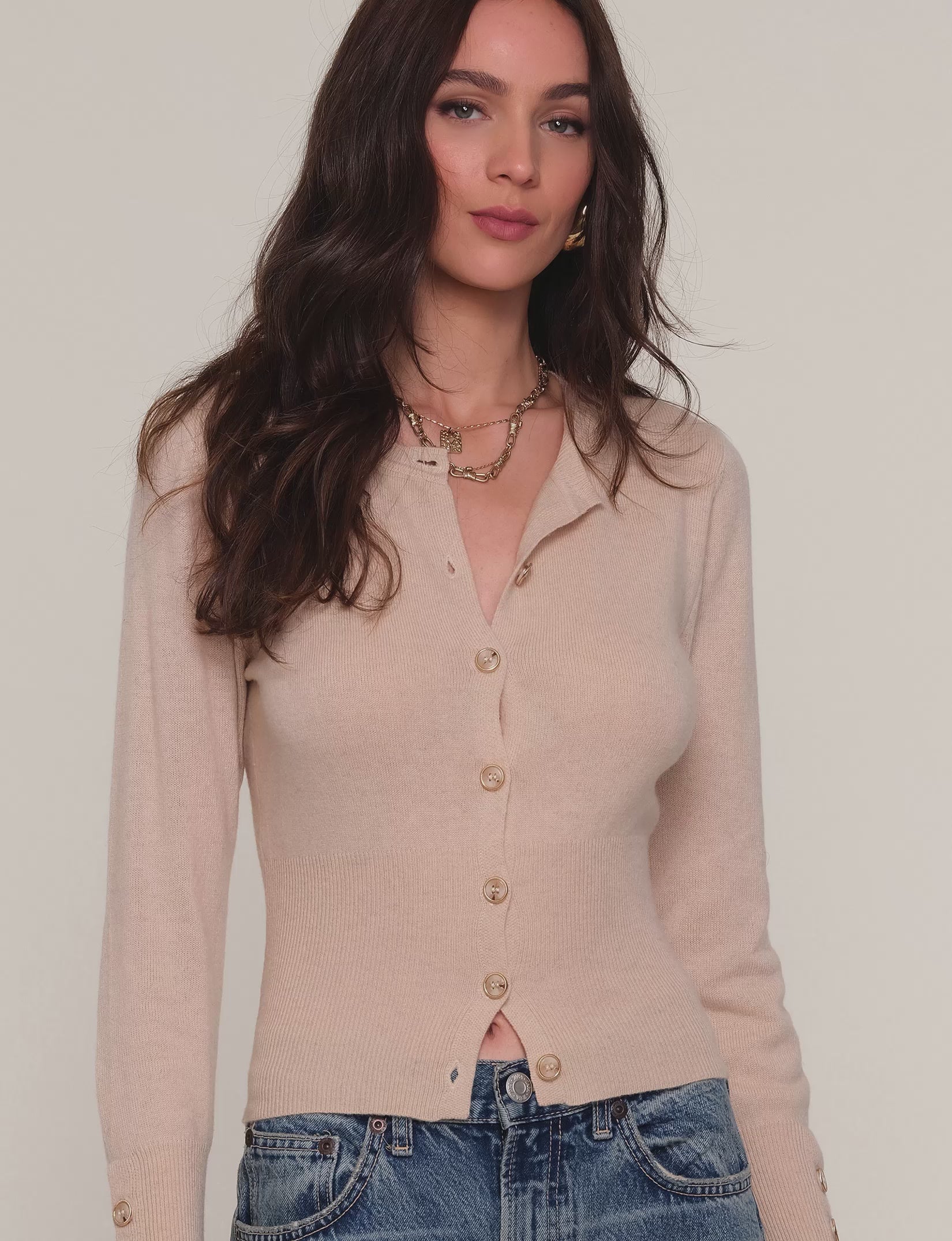 The Seurat Cardi is a super soft cardigan made from a cashmere blend. It has a crew neck, long sleeves and novelty buttons. The body has a rib hem which cinches it in at the waist, making a super flattering fit.