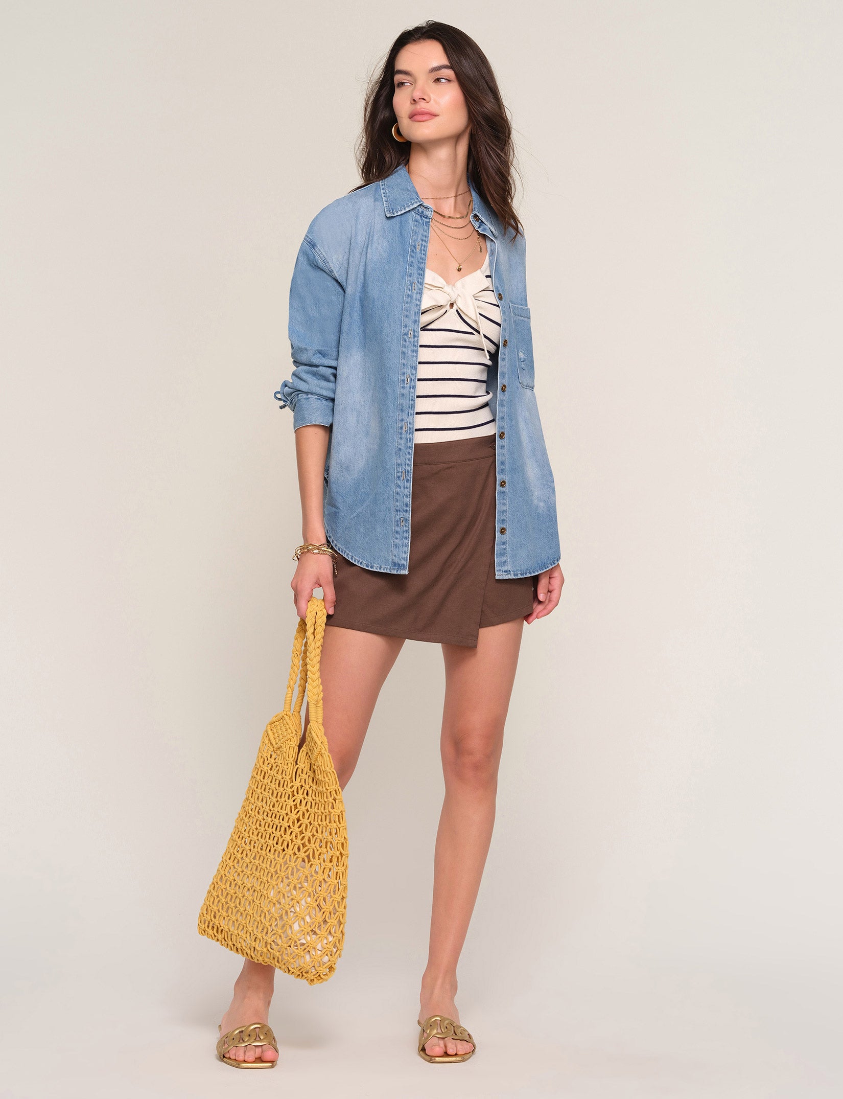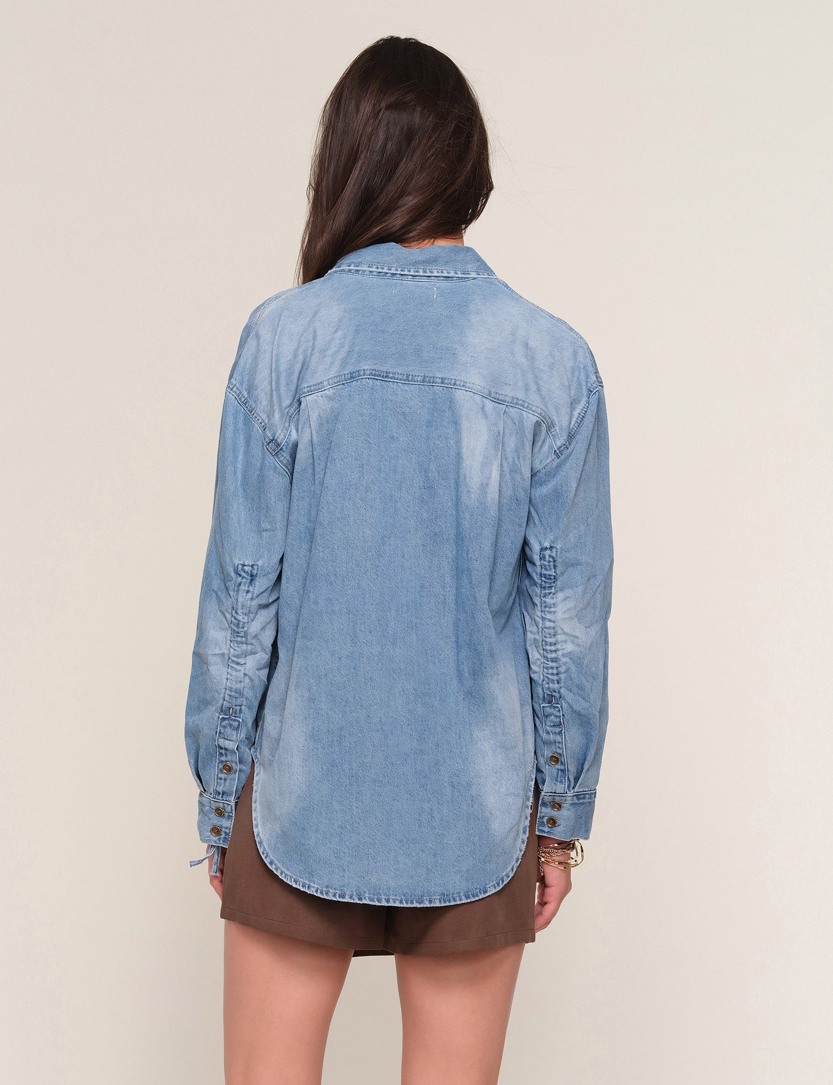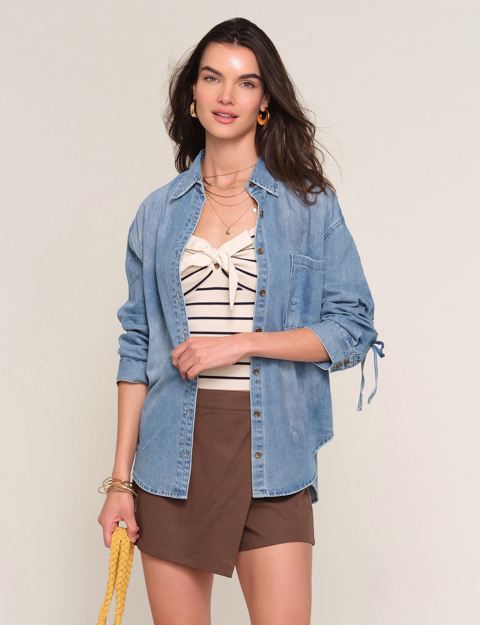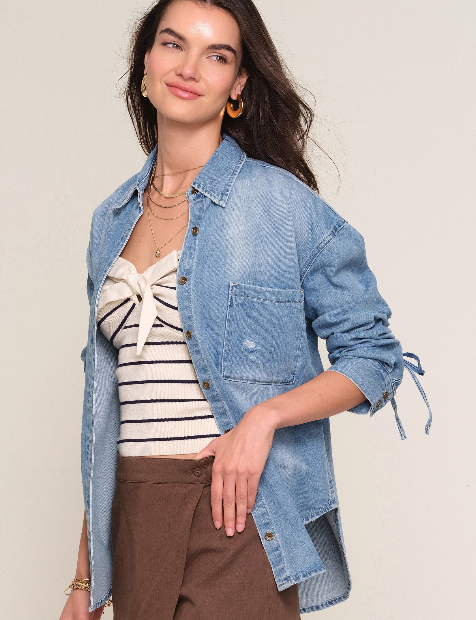 The Shayla Shirt is a Heartloom essential. It features a relaxed fit and shirred sleeves. It's the perfect layering piece for Spring.