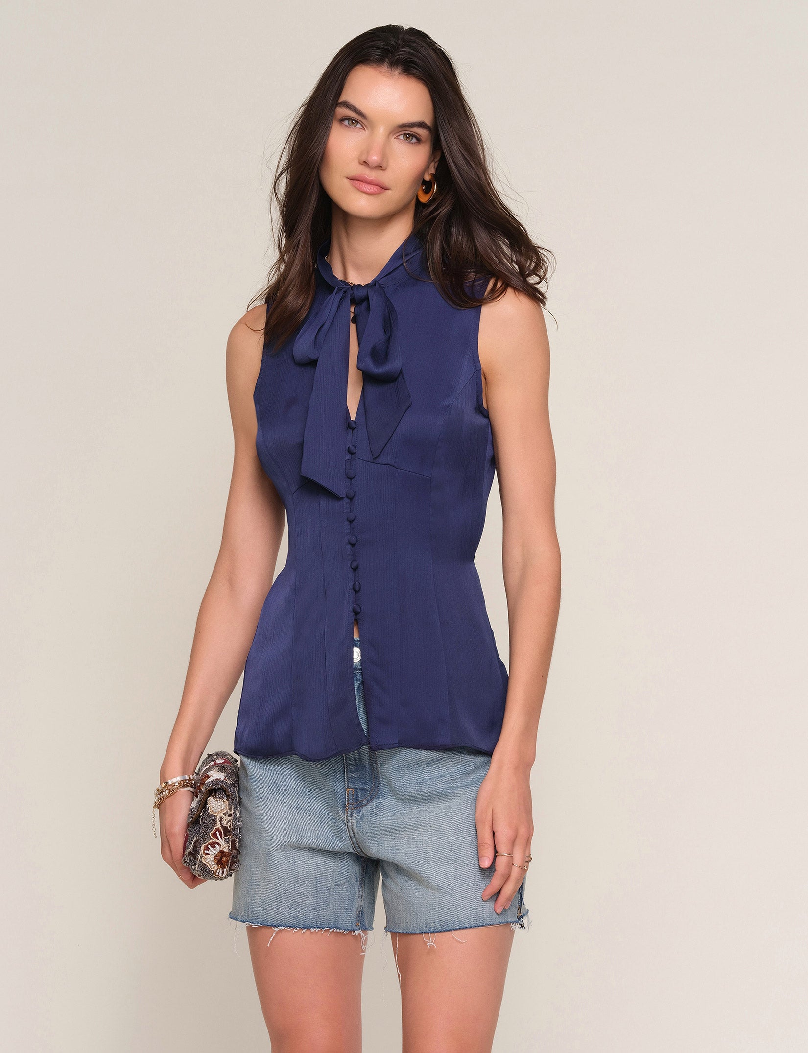 The Soya Top is a feminine blouse made from a soft, draped satin. It features a neck tie and a pinched waist. It's super flattering and the perfect top from desk to date.