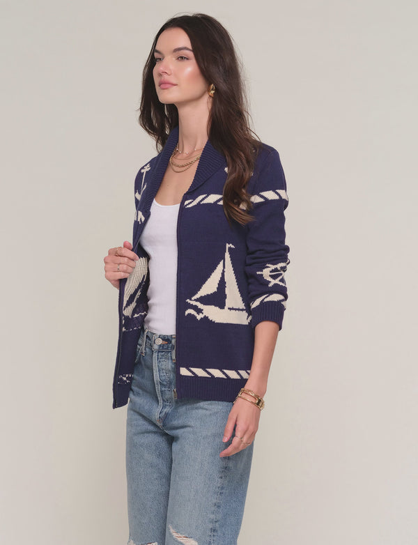 The Trixie Cardi is a perfect zip front cardigan. Throw it on over any spring outfit. It features a vintage inspired, sail boat jacquard.