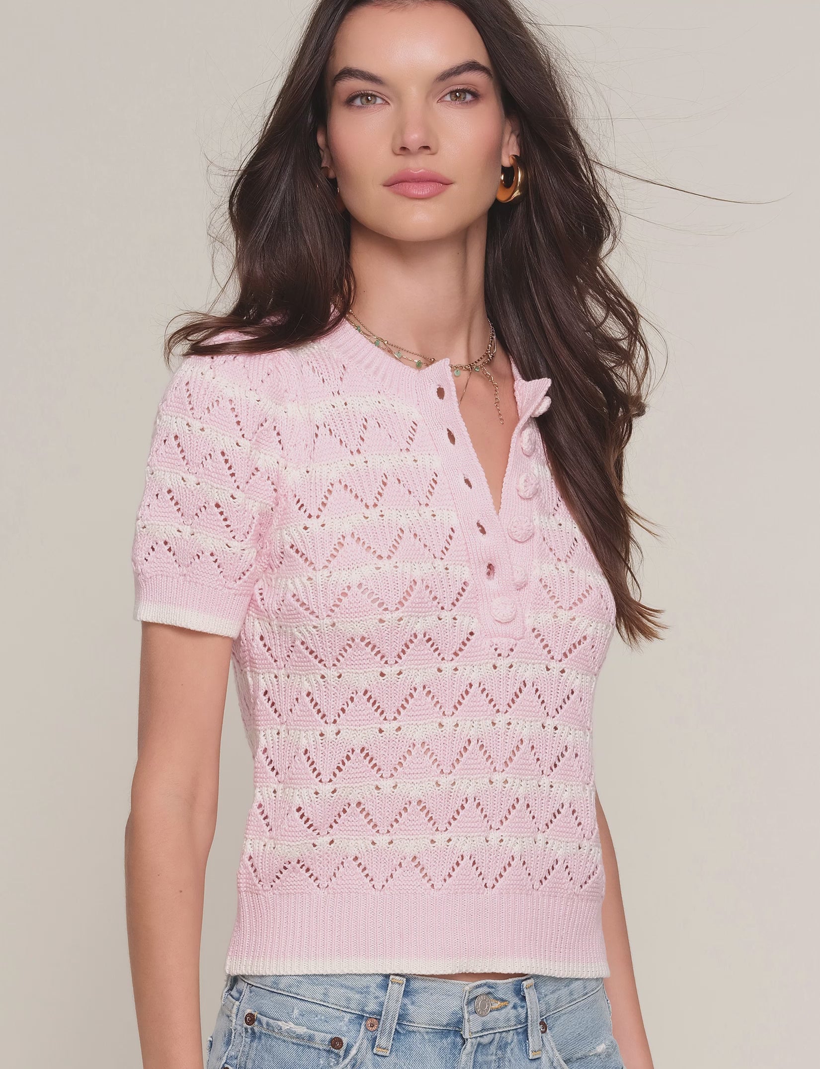 The Verano Top is a short sleeve knit with a henley detail. It features a pointelle stitch with a stripe layout throughout and crochet buttons.