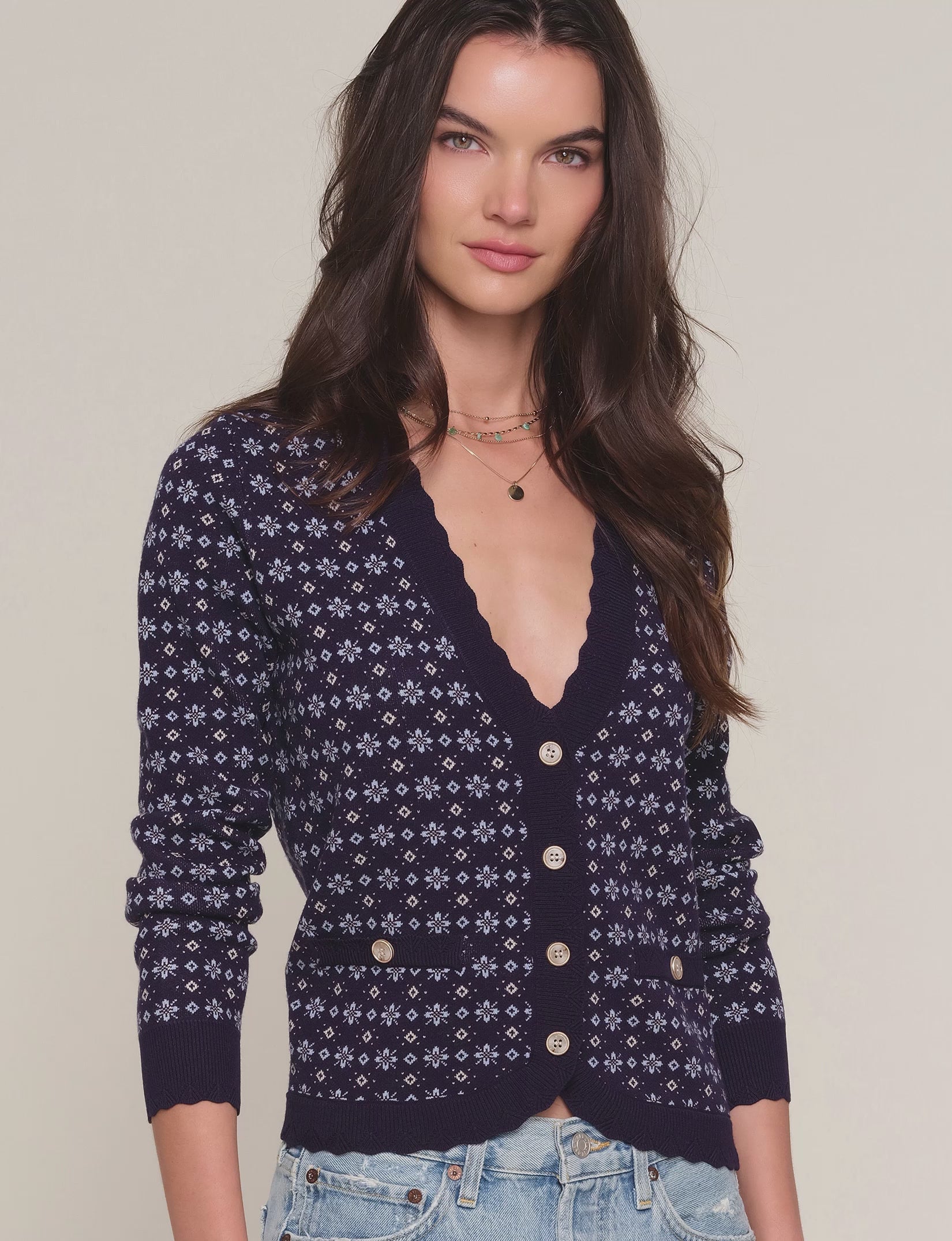 The Vince Cardi is a slim fit cardigan with cute, novelty buttons. It has an all over floral, jacquard and scalloped edges.
