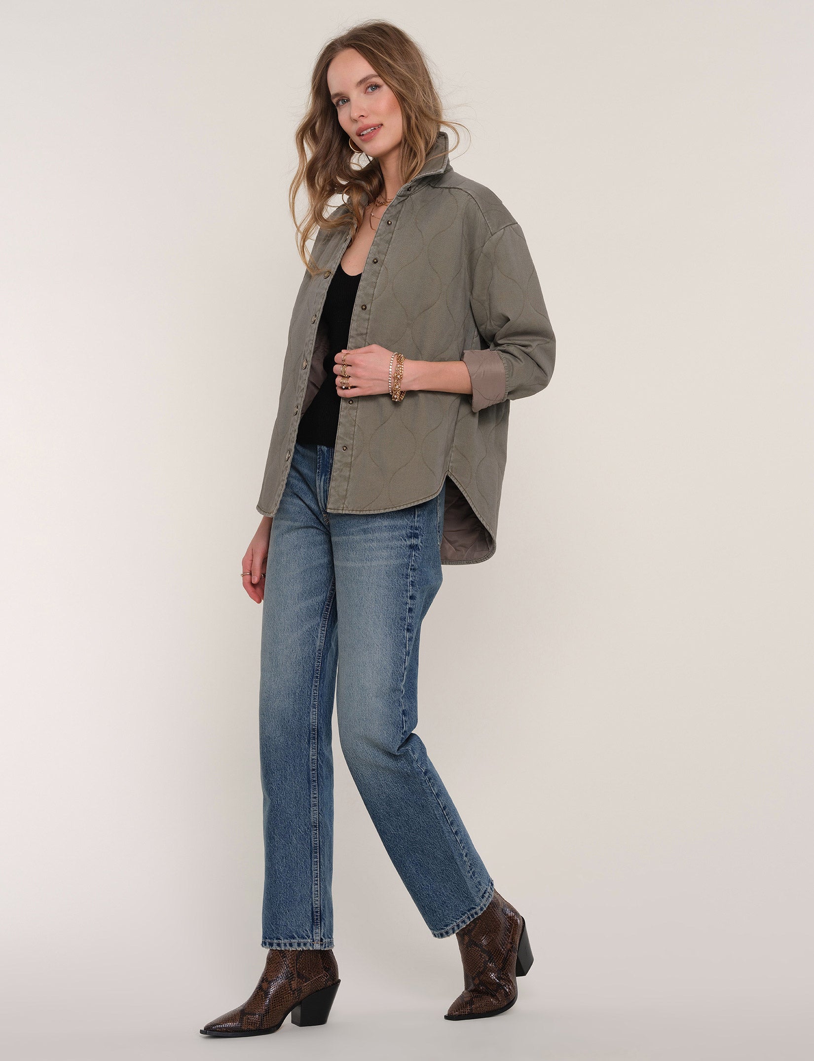 The Vye Jacket is made from a quilted, washed cotton twill. It has a relaxed, cool fit and a snap front closure.