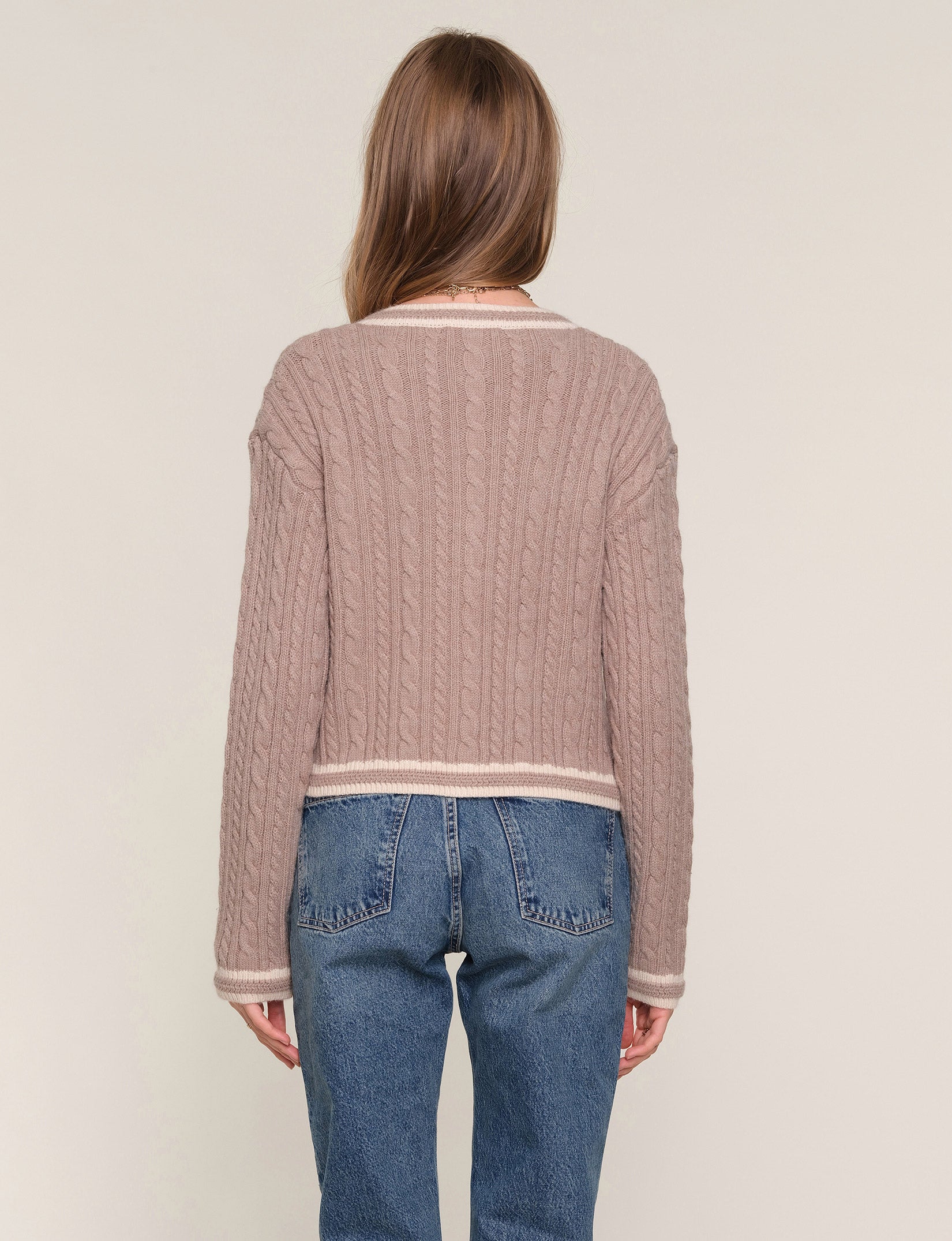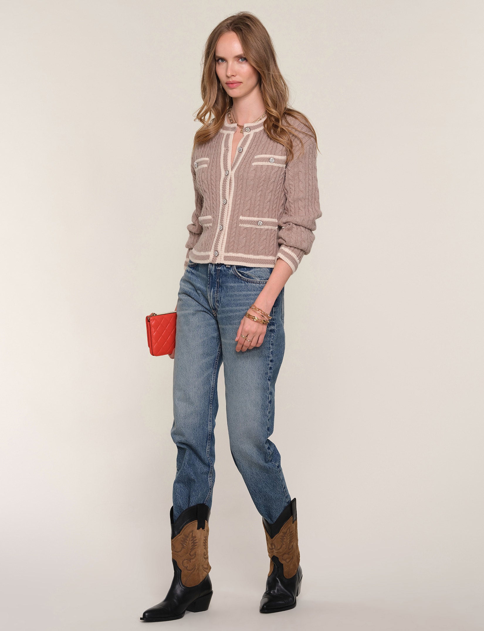 The Yara Cardi is a super soft, crew neck cardigan. It features contrast, striped tipping along the edges and pretty, novelty buttons.
